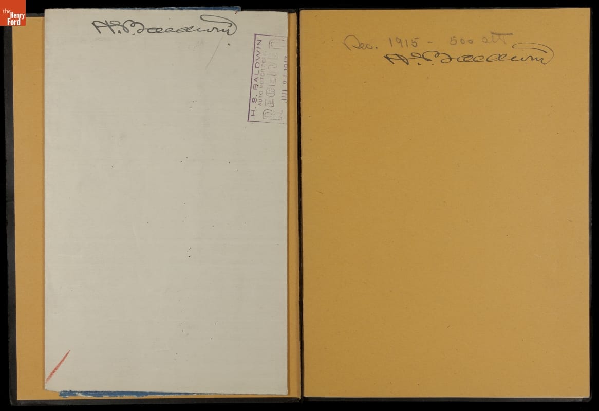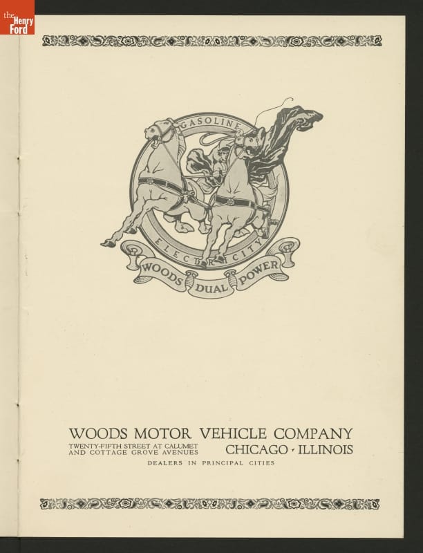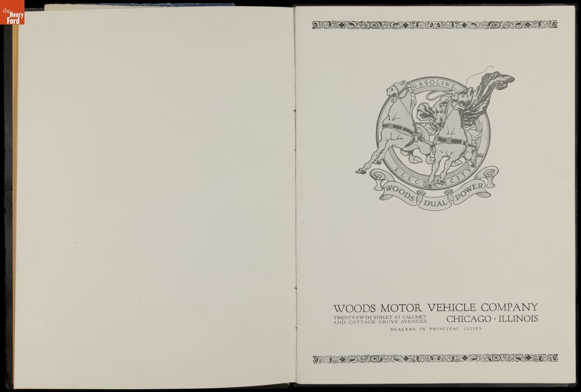 Cover: Woods / DUAL POWER Handwritten inside cover: H.S. Baldwin Title page: [logo]GASOLINE / ELECTRICITY / WOODS DUAL POWER WOODS MOTOR VEHICLE COMPANY / TWENTY-FIFTH STREET AT CALUMET / AND COTTAGE GROVE AVENUES / CHICAGO ILLINOIS / DEALERS IN PRINCIPAL CITIES