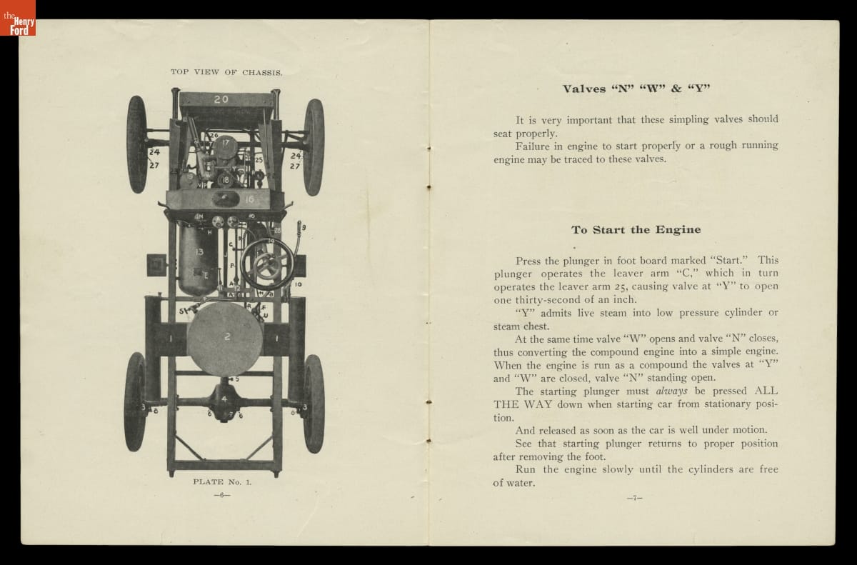 If you had never run a steam engine before, how would you know how to operate a steam-powered vehicle? This 1904 instruction manual helped owners navigate the ins and outs of the White Steam Touring car. Numbered illustrations, parts lists, and "how-to" instructions familiarize drivers with their new vehicle.