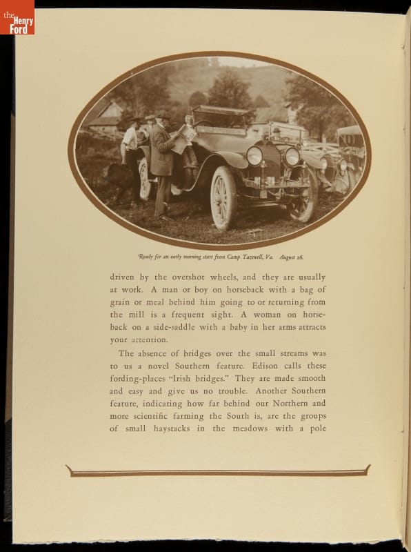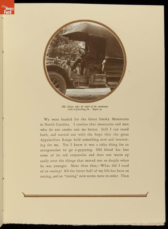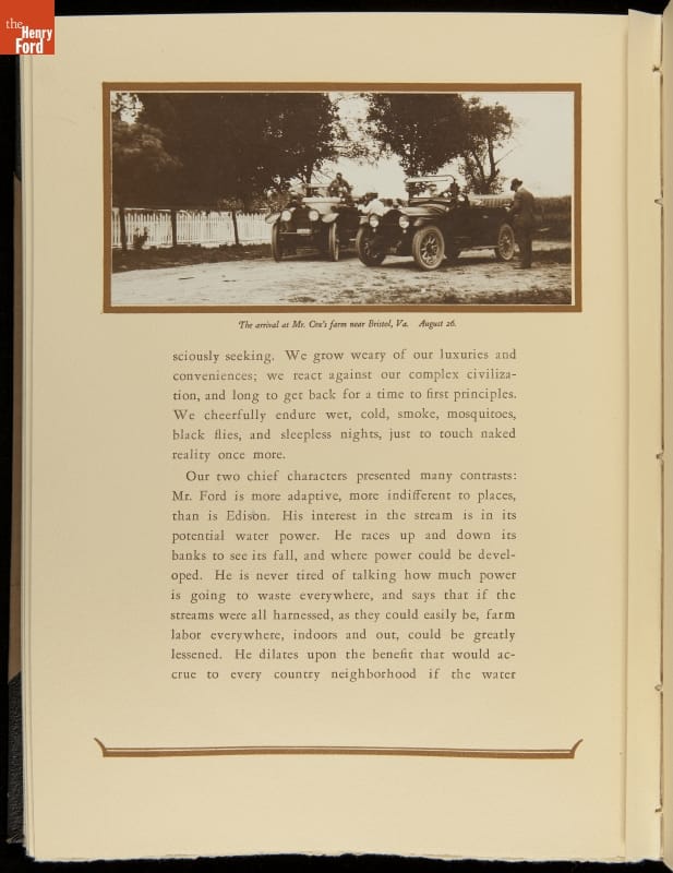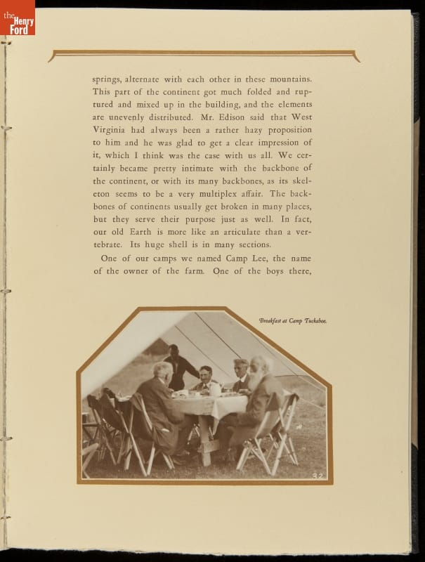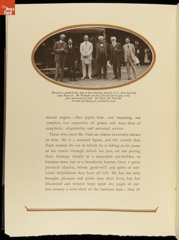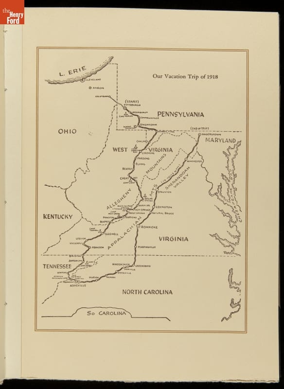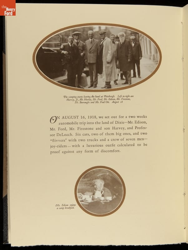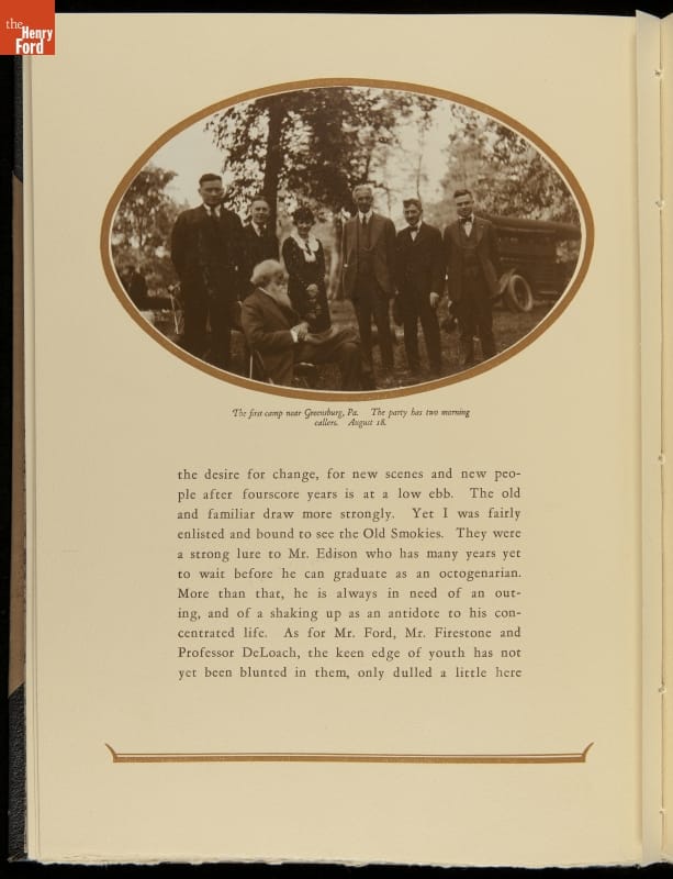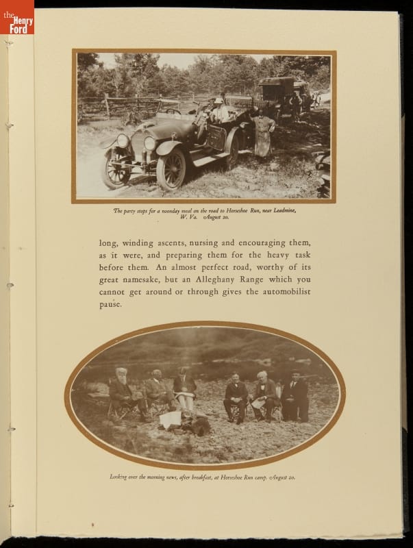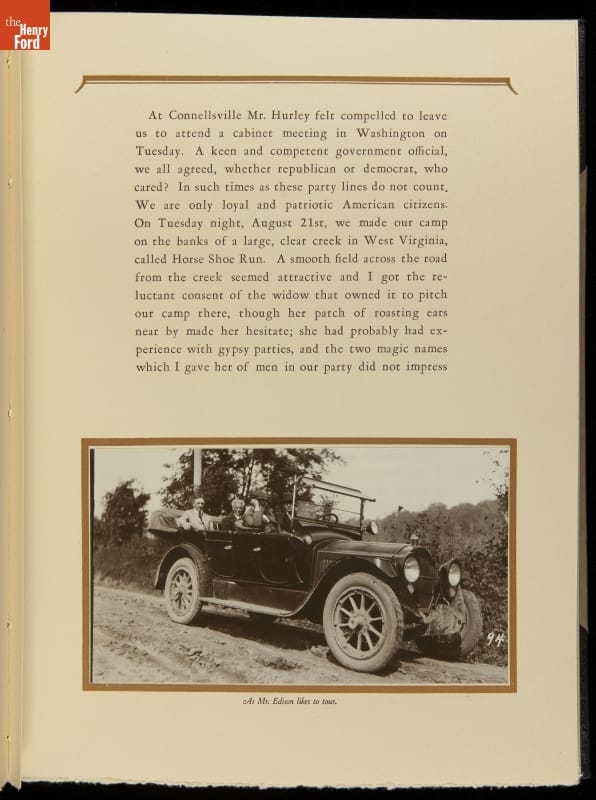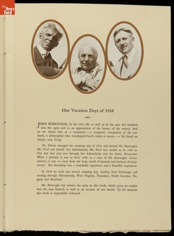 John Burroughs chronicled the Vagabonds' 1918 camping trip through the central Appalachians. The self-named Vagabonds -- Henry Ford, Thomas Edison, Harvey Firestone, and Burroughs -- began taking excursions in 1916 to relax and enjoy each other's company. They were joined by a fifth, Edward Hurley, on this adventure. Firestone later privately published Burroughs's "mock-up" under this title, Our Vacation Days of 1918.