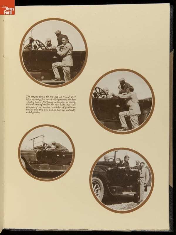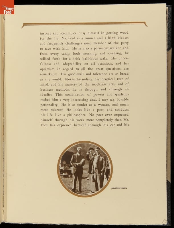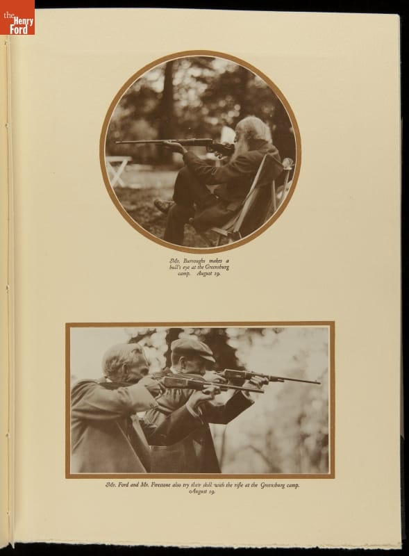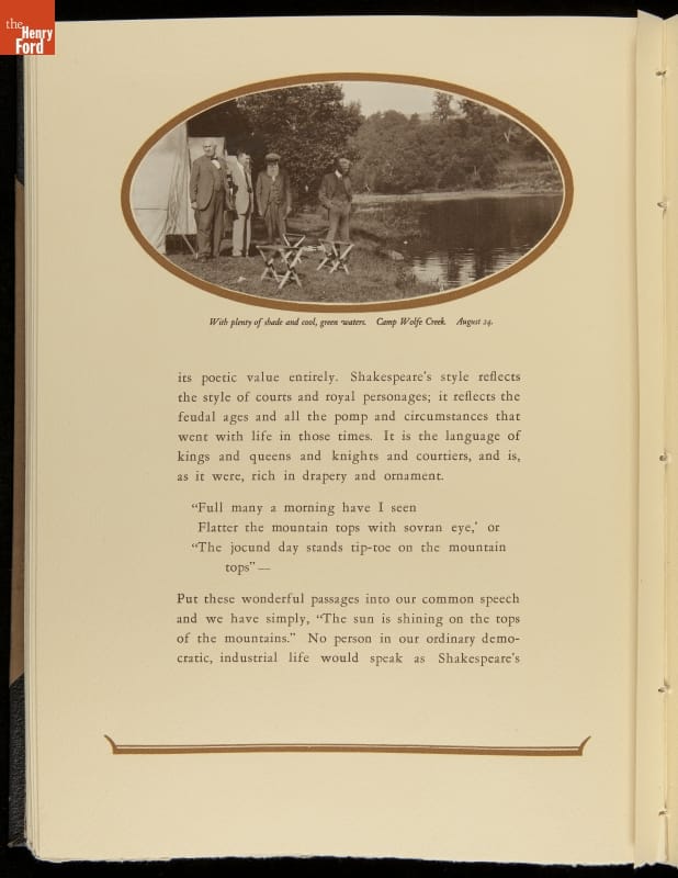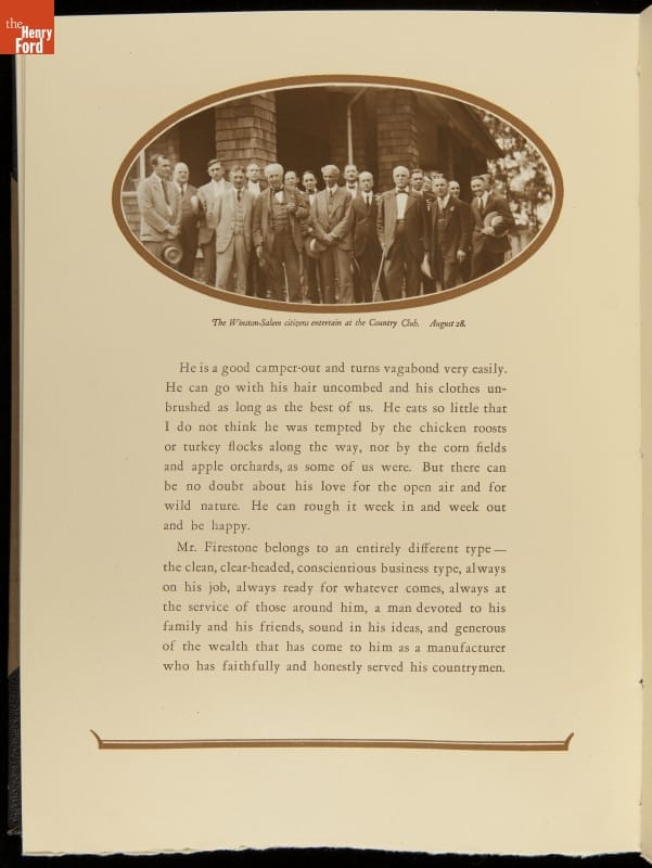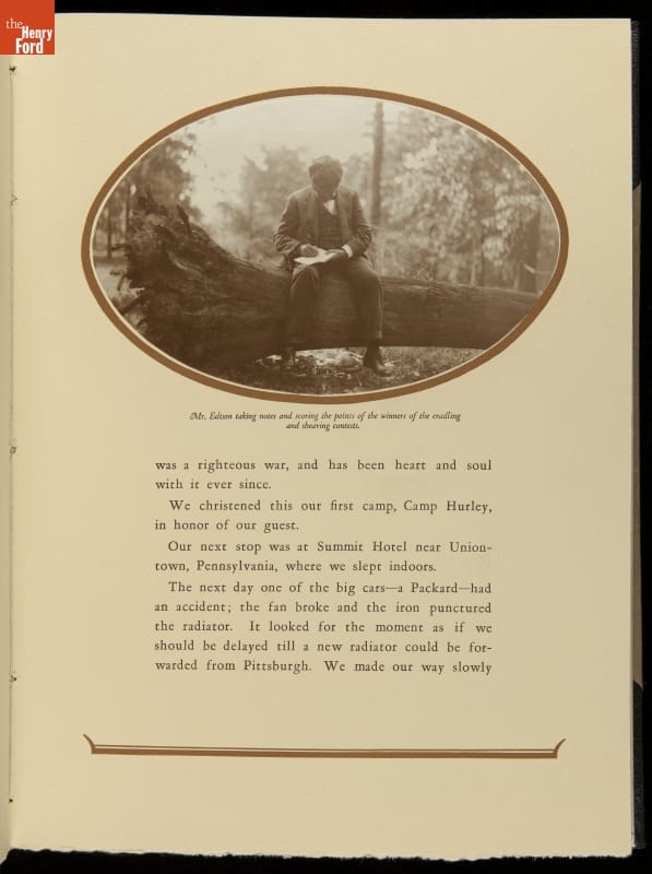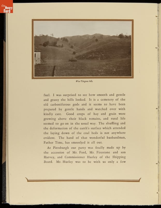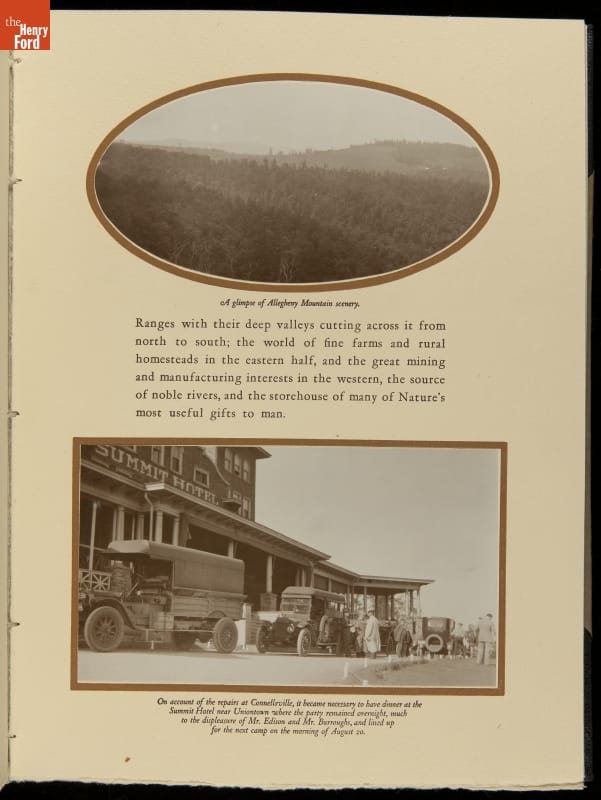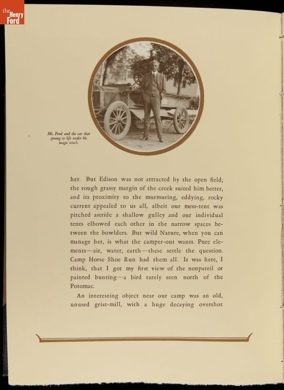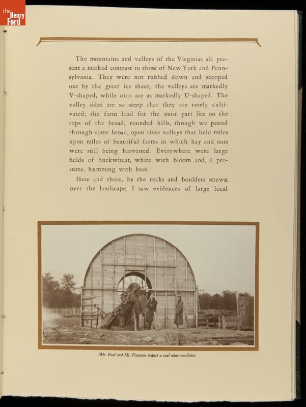 John Burroughs chronicled the Vagabonds' 1918 camping trip through the central Appalachians. The self-named Vagabonds -- Henry Ford, Thomas Edison, Harvey Firestone, and Burroughs -- began taking excursions in 1916 to relax and enjoy each other's company. They were joined by a fifth, Edward Hurley, on this adventure. Firestone later privately published Burroughs's "mock-up" under this title, Our Vacation Days of 1918.