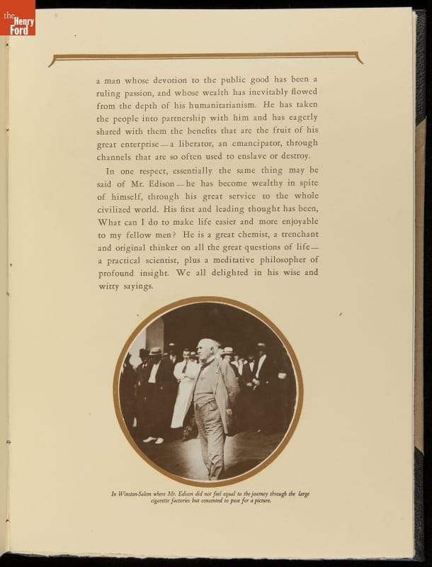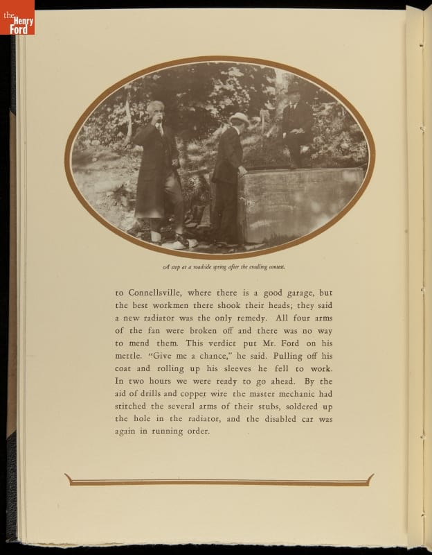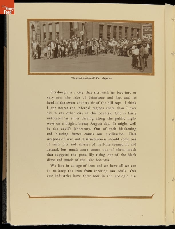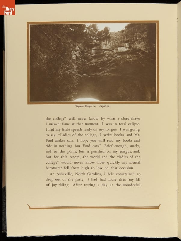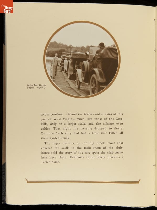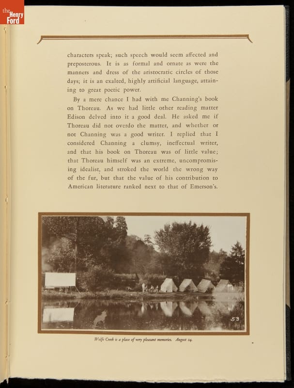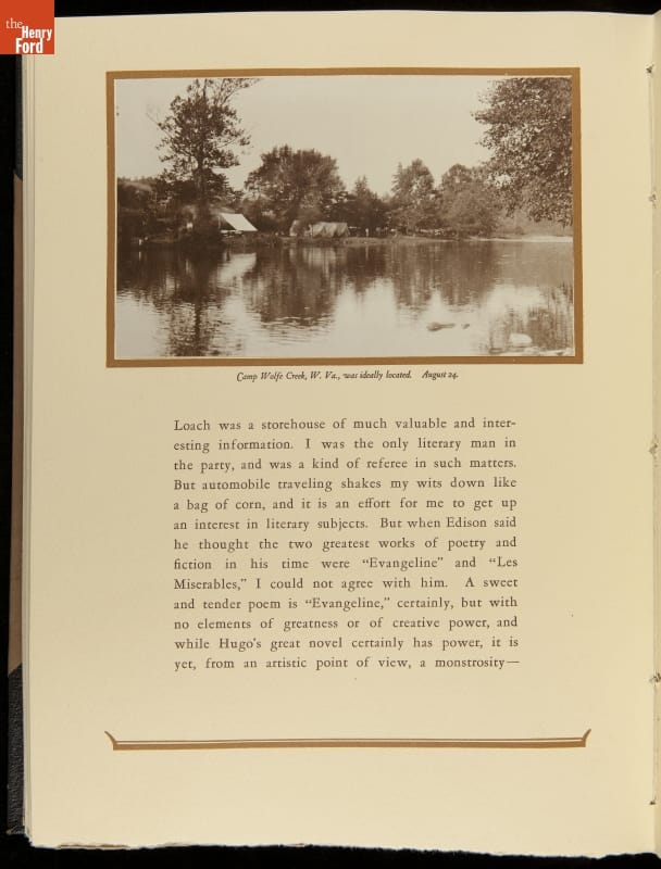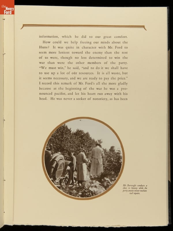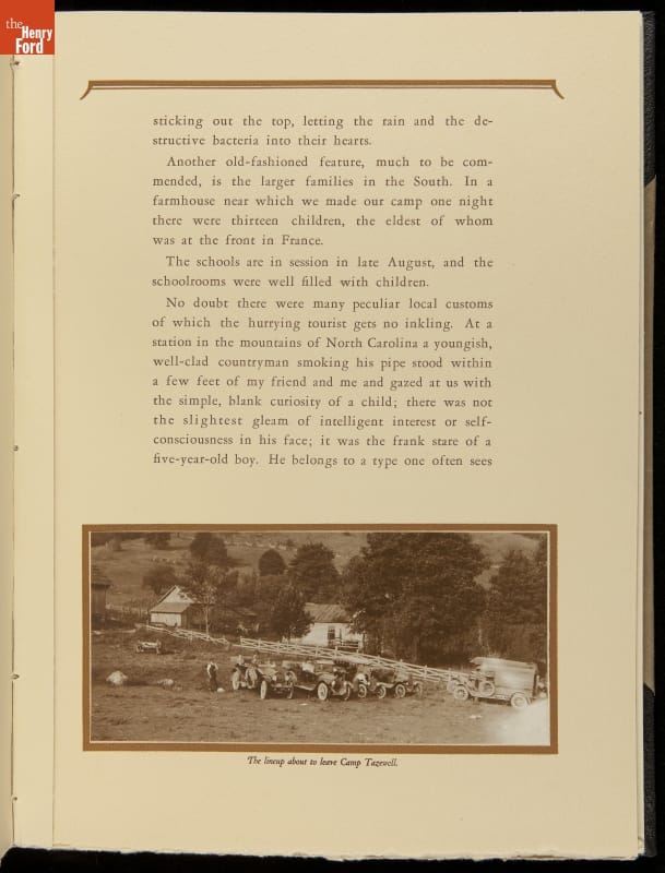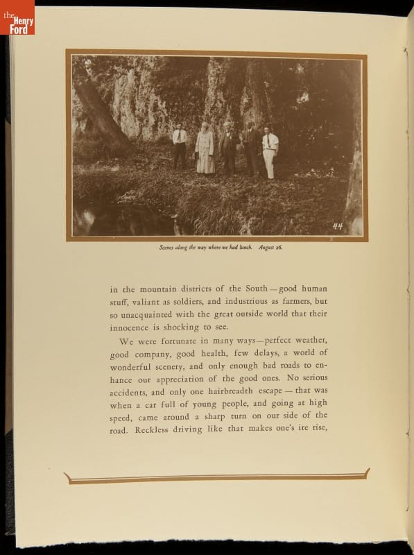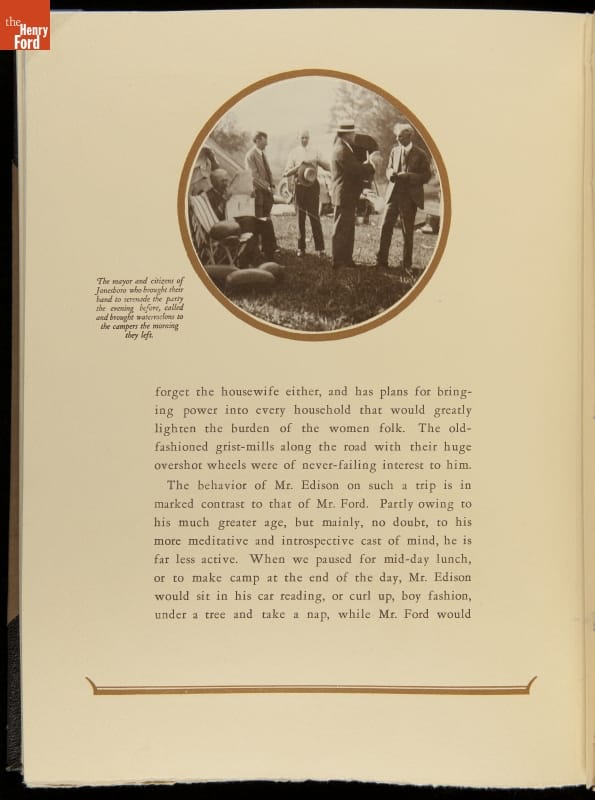 John Burroughs chronicled the Vagabonds' 1918 camping trip through the central Appalachians. The self-named Vagabonds -- Henry Ford, Thomas Edison, Harvey Firestone, and Burroughs -- began taking excursions in 1916 to relax and enjoy each other's company. They were joined by a fifth, Edward Hurley, on this adventure. Firestone later privately published Burroughs's "mock-up" under this title, Our Vacation Days of 1918.