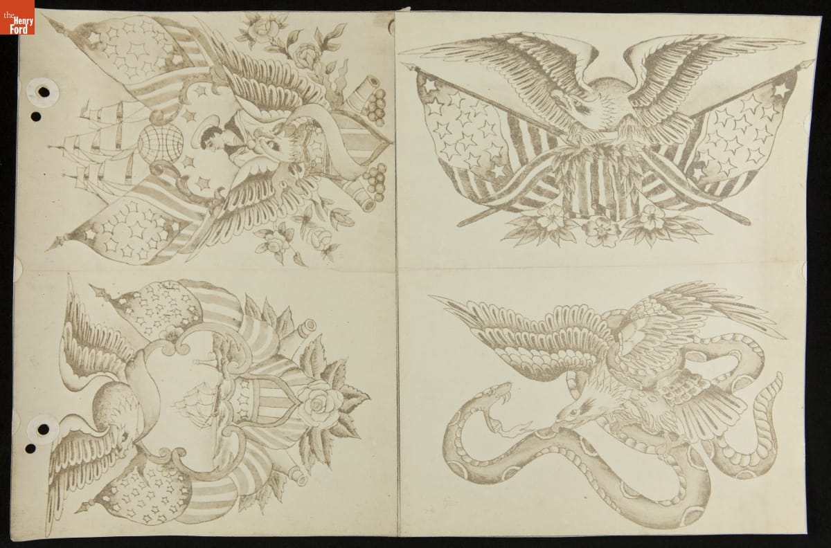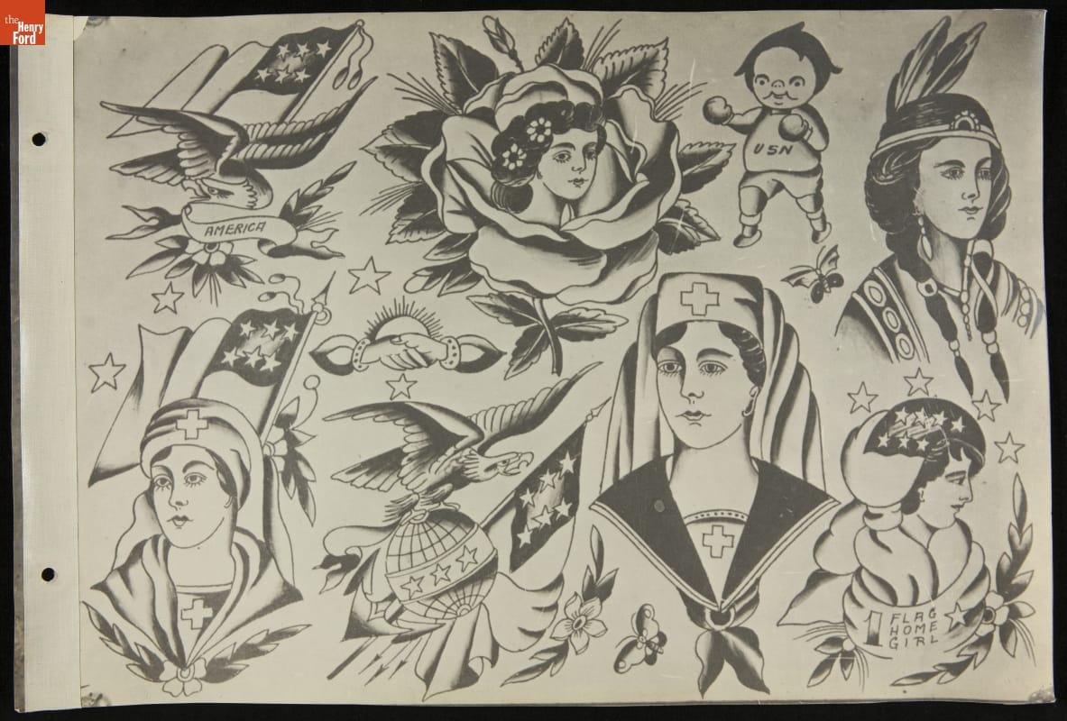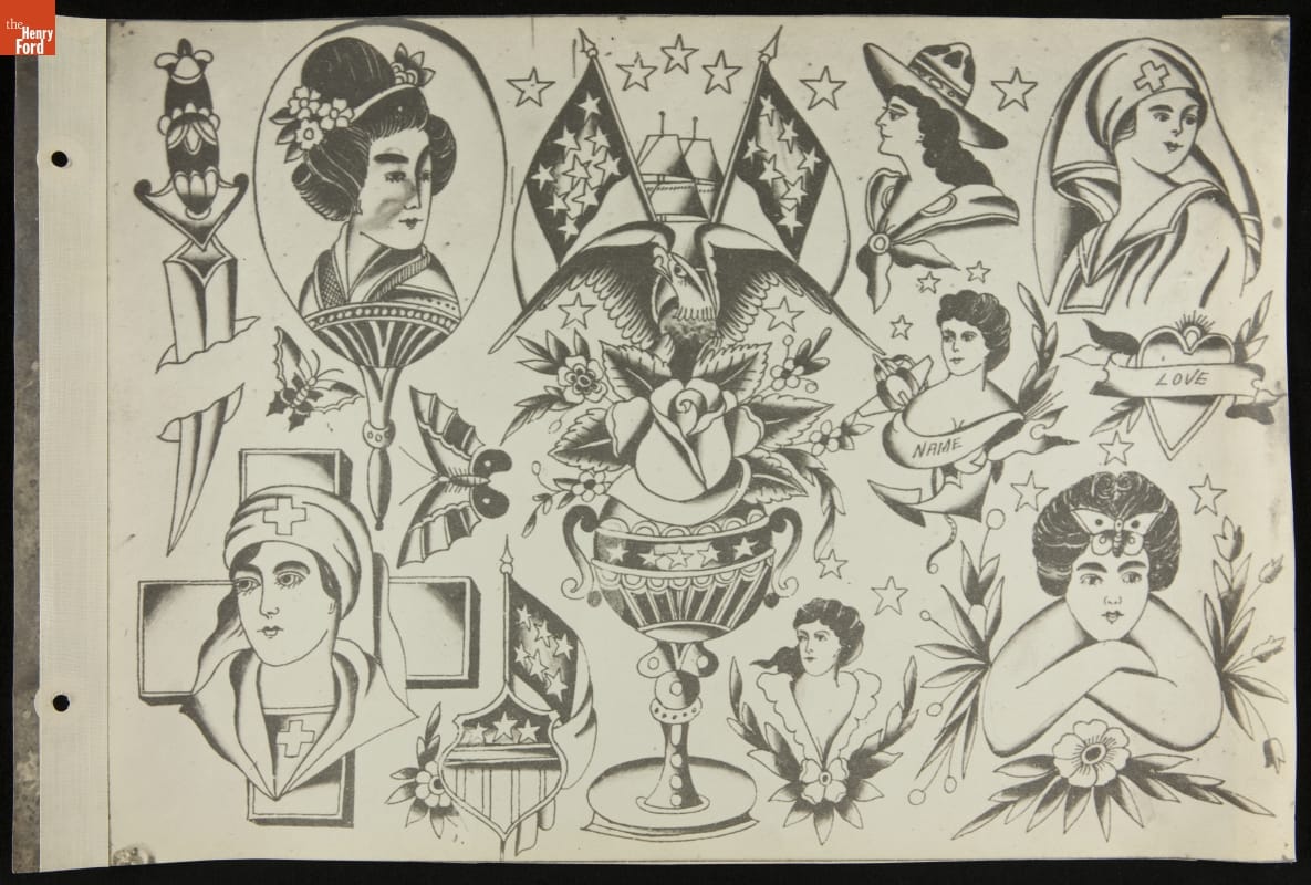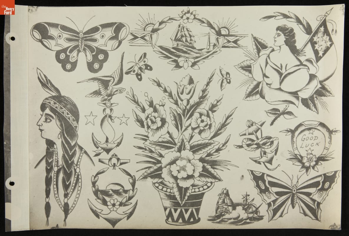 Tattoos communicate stories. Their content ranges from deeply personal and traditional--to regrettable and frivolous. In the early 1900s, "Professor" Waters apprenticed as a tattoo artist in carnivals and New York's Bowery District. He ran a successful supply shop in Detroit (1918-1939), patenting the standard "two-coil" tattoo machine in 1929. Designs from his flash sheets continue to inspire tattooists today.