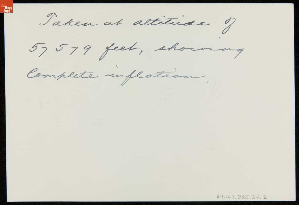 Handwritten on back: Taken at altitude of 57579 feet, showing complete inflation