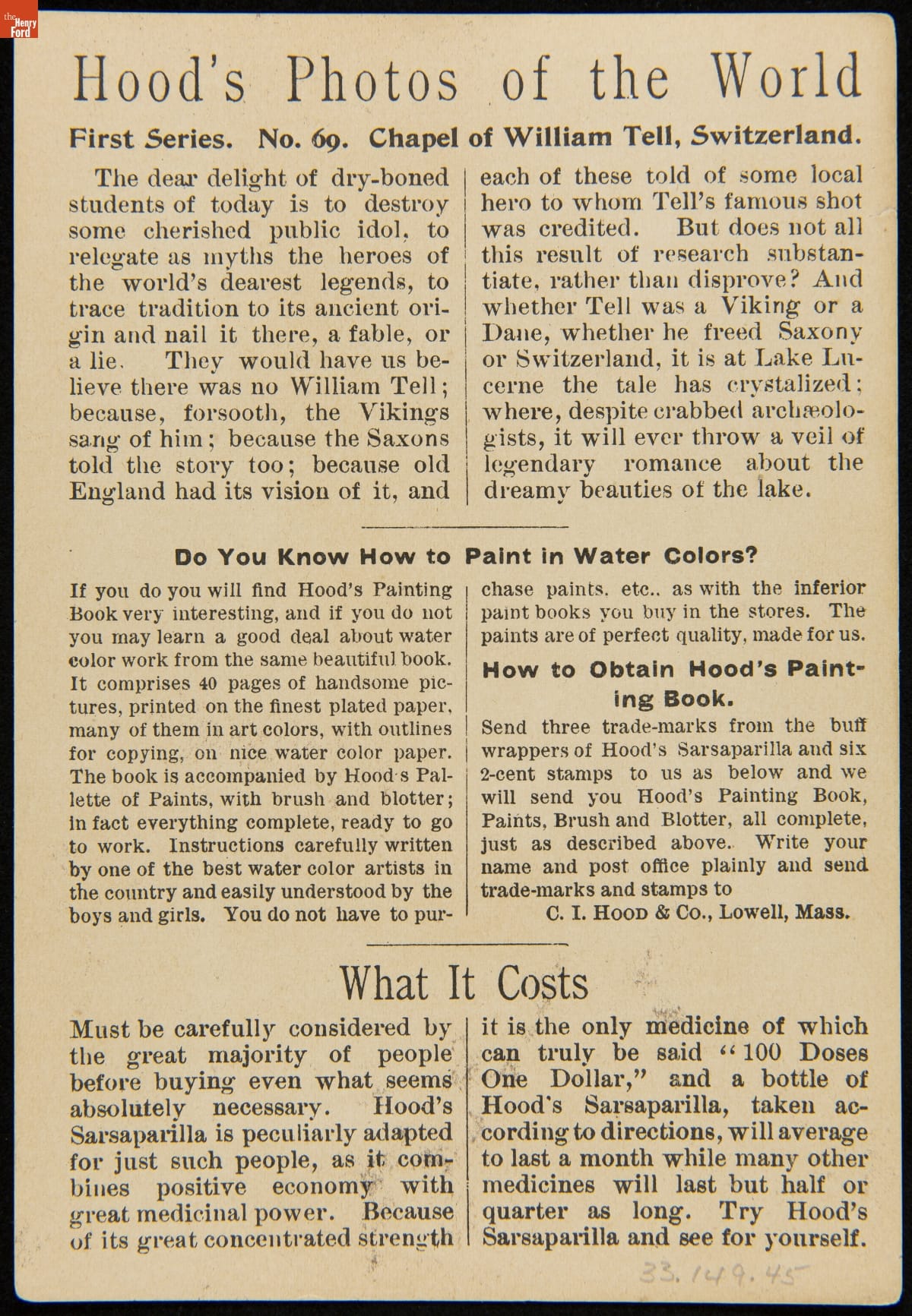 In the late 19th century, trade cards were a major means of advertising goods and services. Patent medicine producer, C.I. Hood & Co., had its own advertising department, creating cookbooks, calendars, and, most abundantly, trade cards. The trade card series, "Hood's Photos of the World," became popular among consumers, as it offered views of far-away places, providing a window to the broader world.
