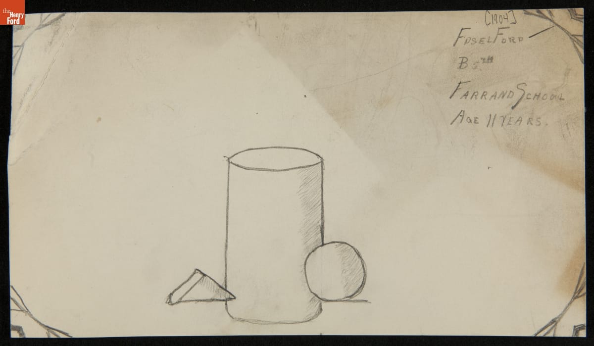 Edsel Ford created this drawing when he attended the Farrand School in Detroit, Michigan. Like many doting parents, Henry and Clara Ford saved their only child's artwork. Clara nurtured Edsel's love of art and Henry encouraged his interest in automobiles. As Edsel grew, his creative and artistic sensibilities matured and he developed a talent for automotive design.