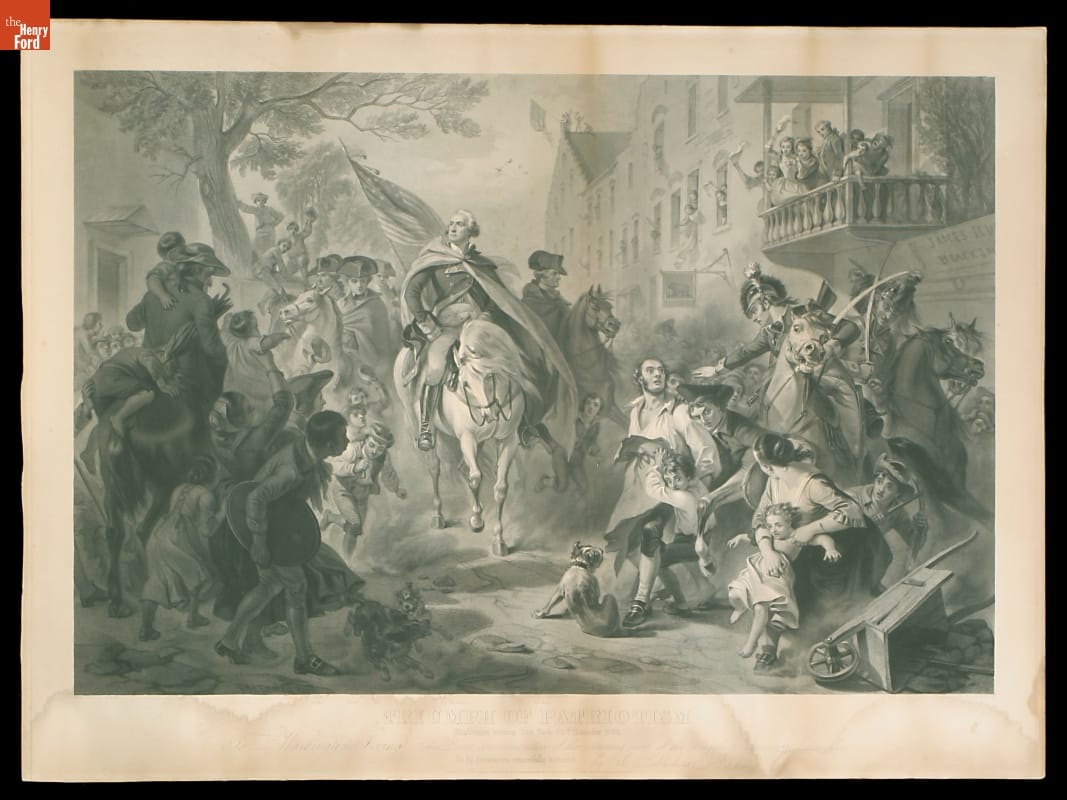 Mass-produced prints marked the seventy-fifth anniversary of "Evacuation Day," the day that British troops left New York City after the Treaty of Ghent officially ended the American Revolution. General George Washington and the Continental Army entered the city with pomp and circumstance to signify the war's end.