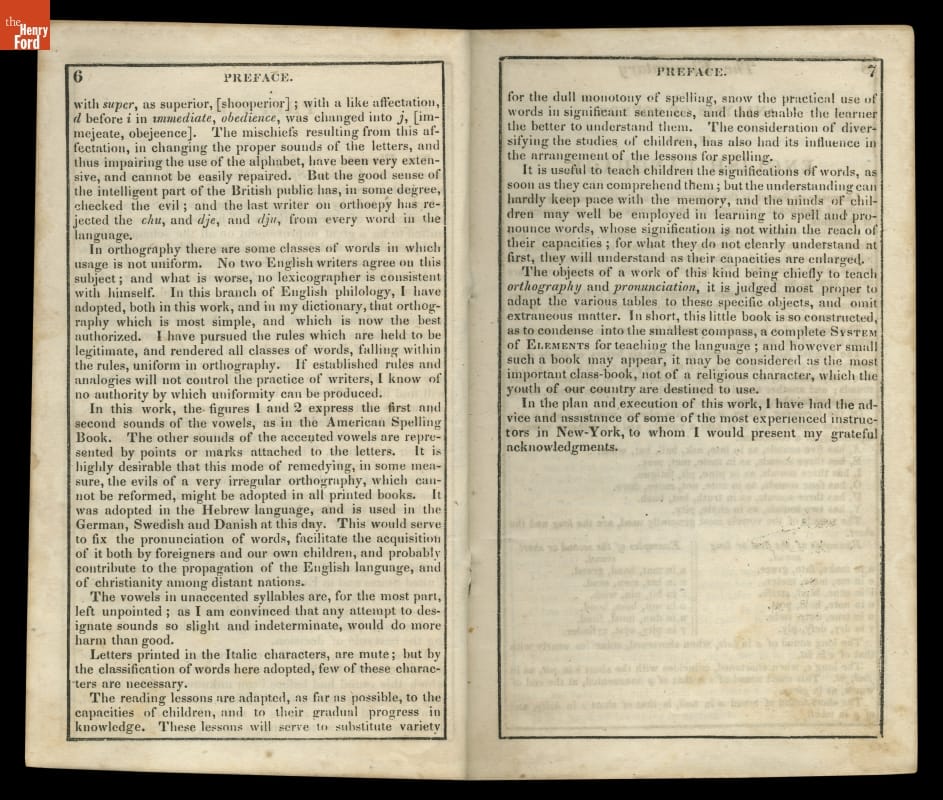 Noah Webster's speller offered simple guidelines for spelling and pronouncing American English words. Age-appropriate lessons taught schoolchildren to read and write, helping to define and unify American language. Known by its colored cover, Webster's "blue-backed speller" remained popular for more than 100 years. It sold so well that Webster was able to construct his New Haven, Connecticut, home using the proceeds.