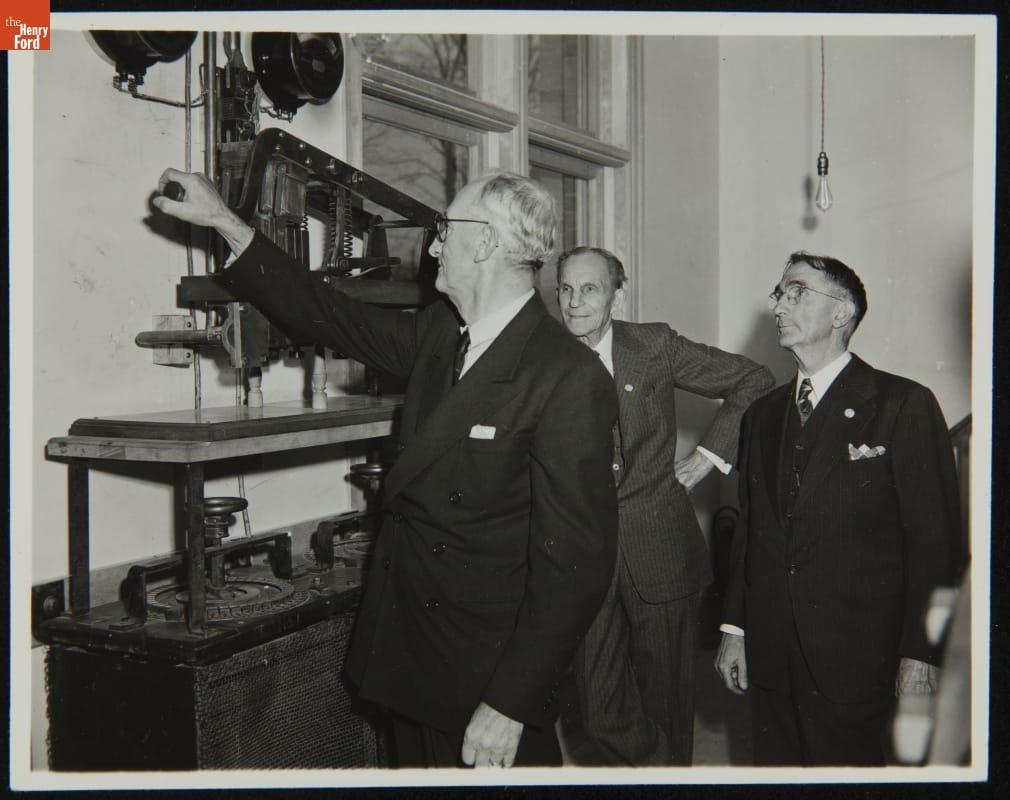 In 1944, Henry Ford constructed an edited, scaled-down version of the Detroit power plant where he had worked as chief engineer in the 1890s. Ford's former Edison Illuminating Company coworkers George Cato (left) and Jim Bishop (right) assisted with the project and participated in the November dedication ceremony in Greenfield Village.