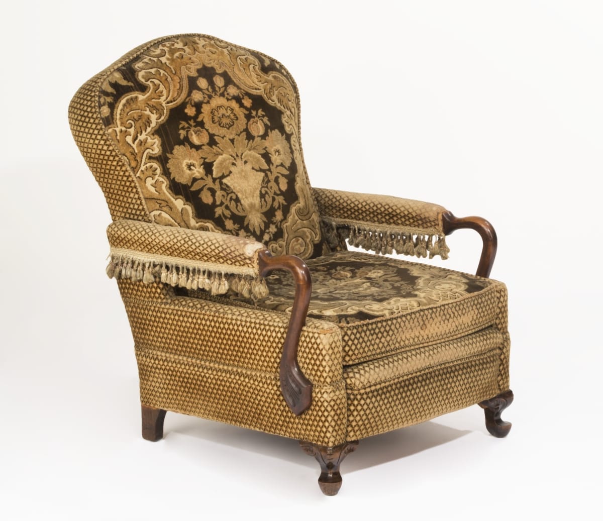 This reclining chair was one of the first upholstered chairs produced by La-Z-Boy co-founders Edwin Shoemaker and Edward Knabusch. The earliest La-Z-Boys featured a patented reclining system and included a separate ottoman. Later technical refinements would produce a built-in footrest, eliminating the need for an ottoman and leading to the modern La-Z-Boy recliner.