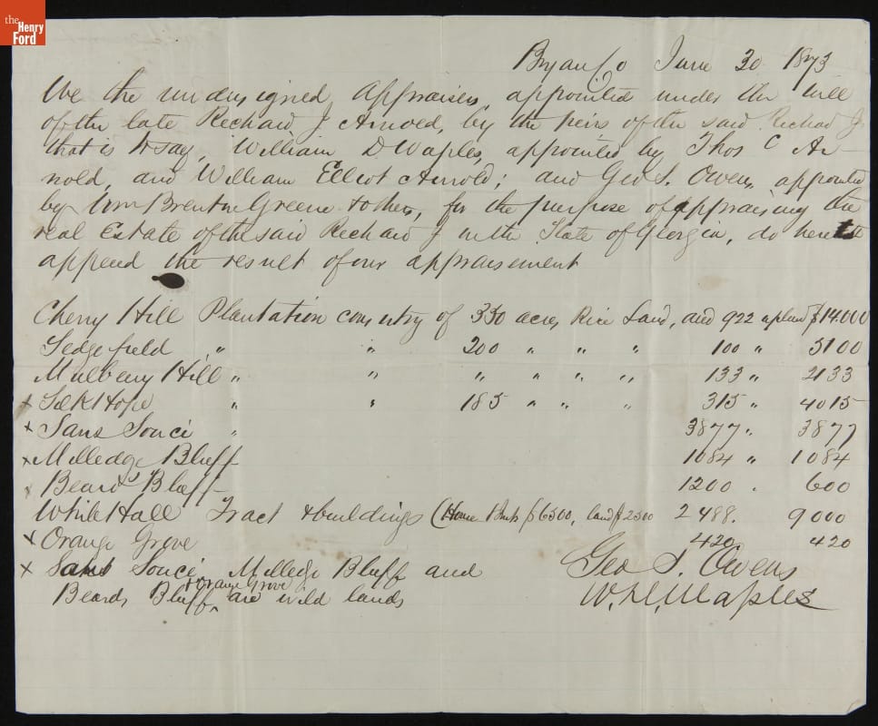 Appraisal of R. J. Arnold's Bryan County, Georgia Properties, June 30, 1873