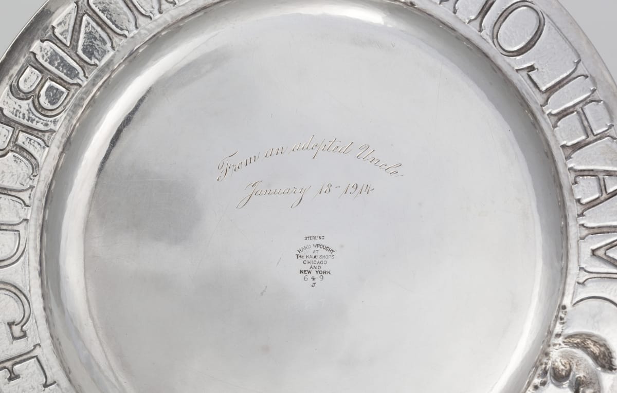 in large letters around rim: MAHLON BAINBRIDGE FOLWELL inscribed on back: From an adopted Uncle / January 18 1914 stamped on back: STERLING / HAND WROUGHT / AT / THE KALO SHOPS / CHICAGO / AND / NEW YORK / 649 / J