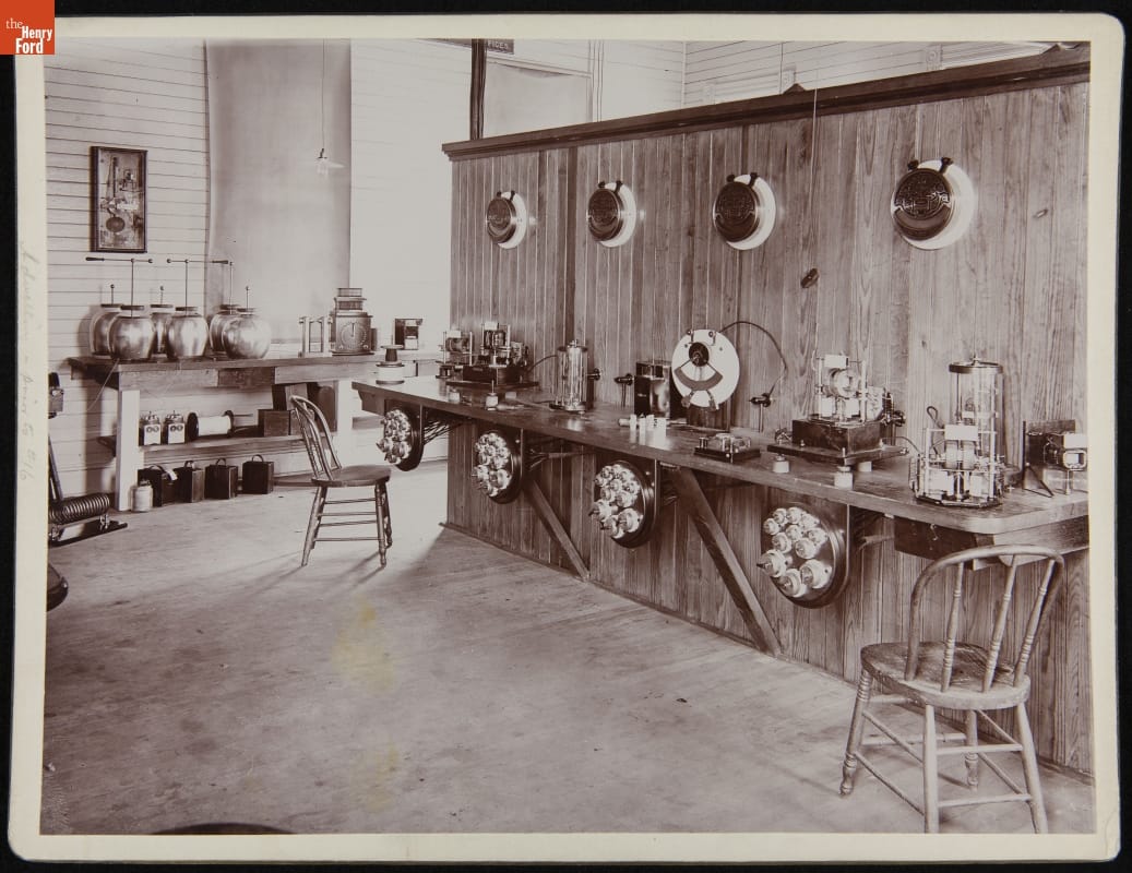 The Fort Wayne Electric Corporation had manufactured arc lamps, dynamos and other lighting and electrical equipment since 1881. By 1894, the company had survived financial difficulties, a corporate reorganization and a recent name change. Aided by well-respected electricians, engineers and inventors, the Indiana company expanded and increased its production efforts. This photograph shows the laboratory where meters and other instruments were tested and calibrated.