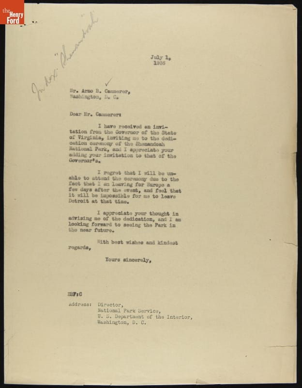 Letter from Edsel Ford to Arno Cammerer regarding Shenandoah National Park Dedication, July 1, 1936