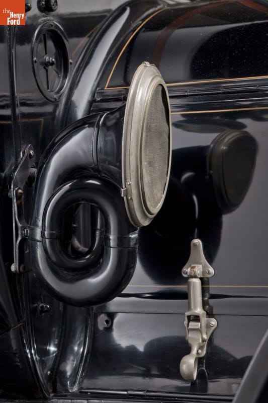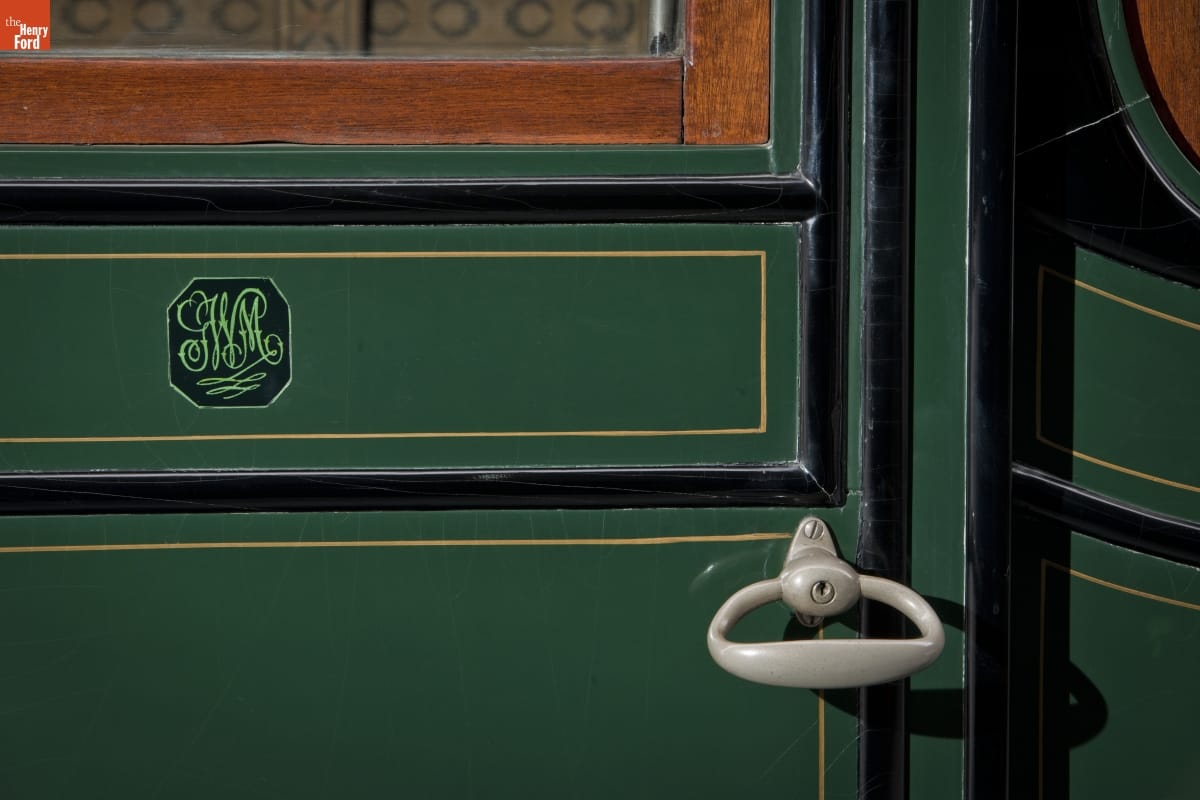 This limousine was designed to make a grand entrance. And it wasn't short on style either. Owners gazed through French plate-glass windows lined with silk curtains. They enjoyed an umbrella holder, a hat rack, a flower vase, and interior electric lights. Even the chauffeur's compartment was done up in leather and mahogany.