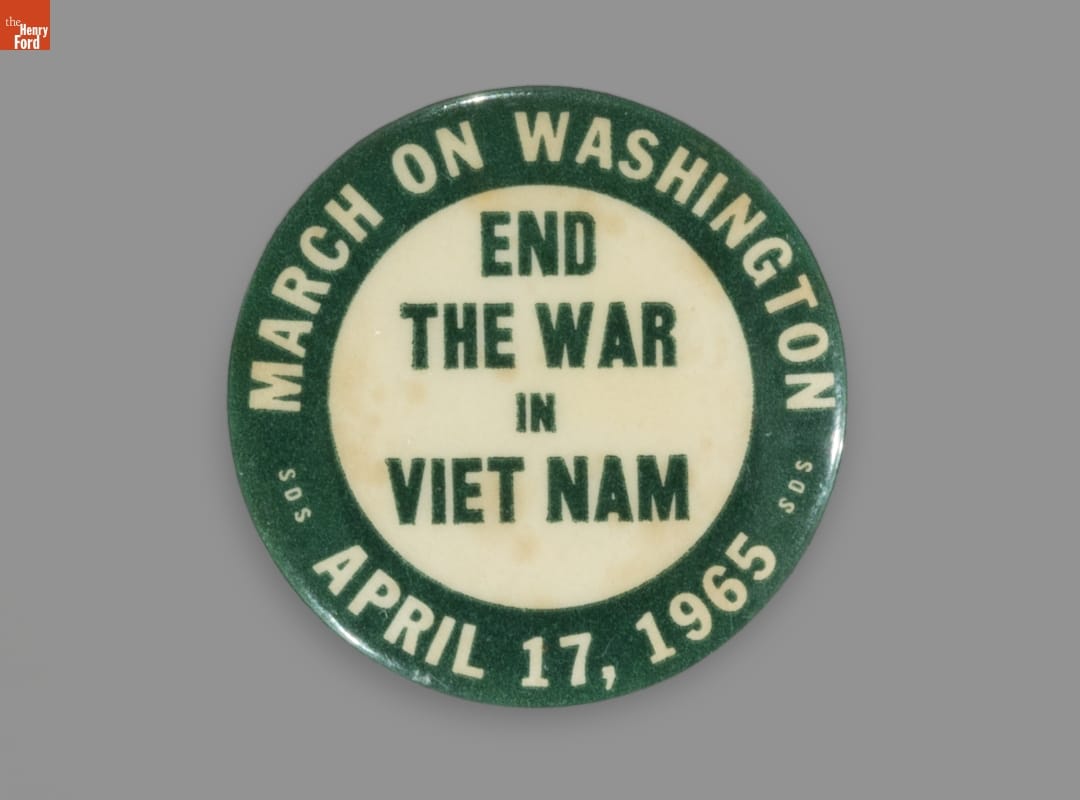 on front, in green circular border: MARCH ON WASHINGTON / SDS APRIL 17, 1965 SDS in white interior circle: END / THE WAR / IN / VIET NAM