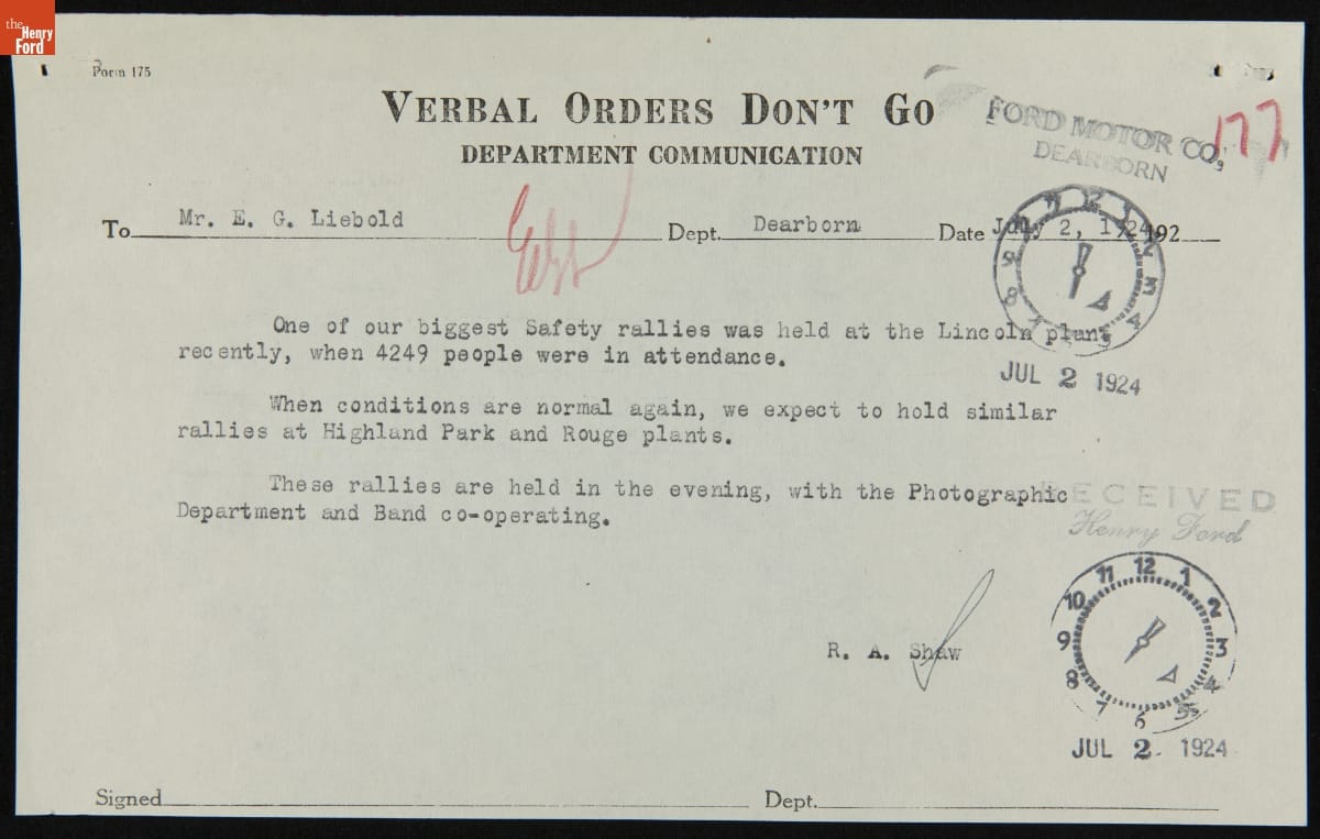 Worker Safety Rally at Lincoln Motor Company Plant, Detroit, Michigan, 1924