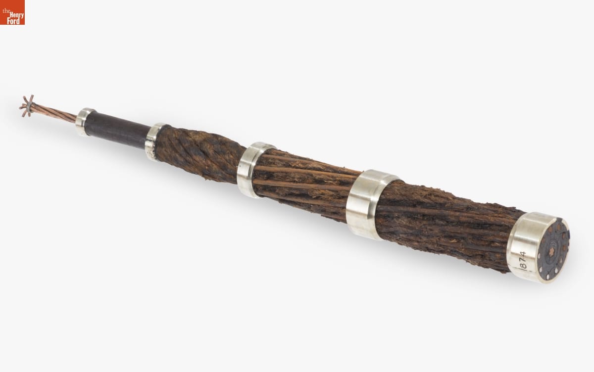 This cable is part of a display of transatlantic telegraph cables dating from 1858-1928. This cable section was part of a system laid from Heart's Content, Newfoundland, Canada to Valencia, Ireland in 1874.