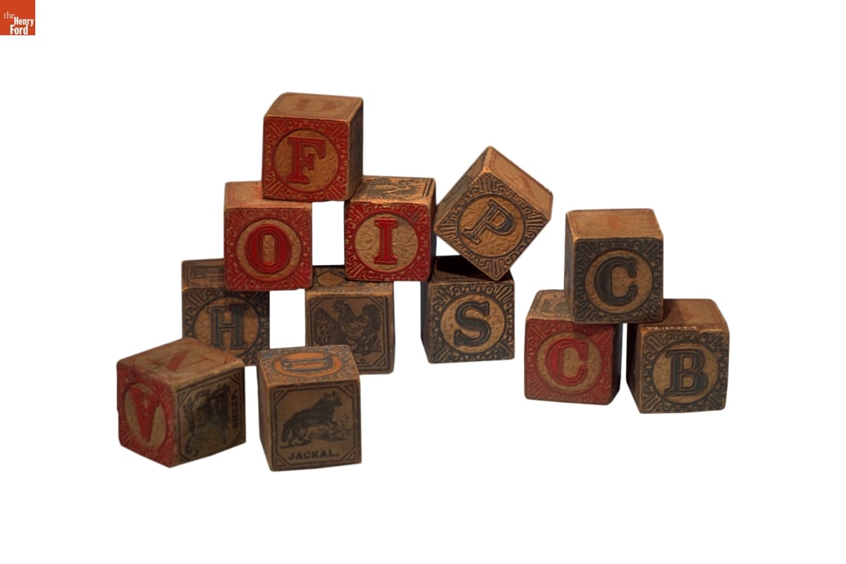 By 1900, many American toy companies mass-produced wooden alphabet blocks with raised ornamentation and colorful printing. These blocks belonged to Henry and Clara Ford's son, Edsel. Along with letters, they feature images of animals with their names printed below. Words on the blocks encouraged children to think about letter sounds and spelling while they played.