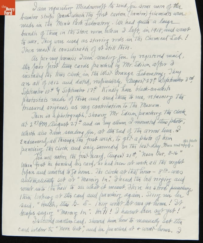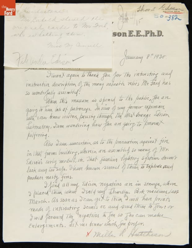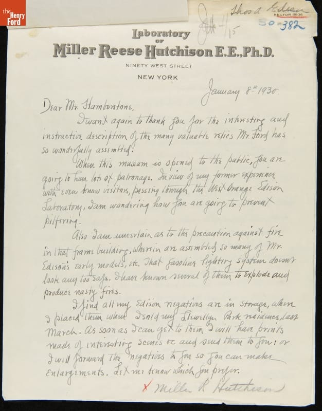 Letter from Miller Reese Hutchison regarding Donating Thomas Edison Time Cards to Henry Ford Museum, January 8, 1930