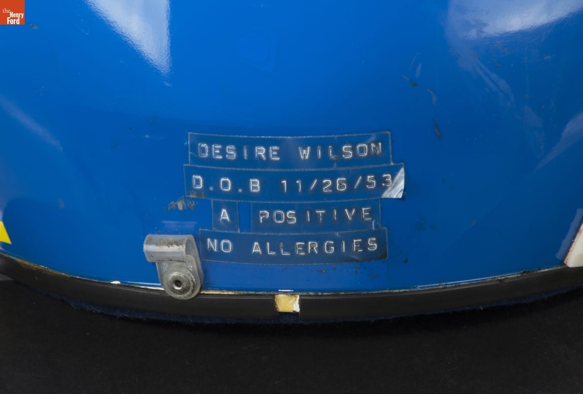 on left and right sides: DESIRE on typed sticker on back of helmet: DESIRE WILSON / D.O.B. 11/26/53 / A POSITIVE / NO ALLERGIES