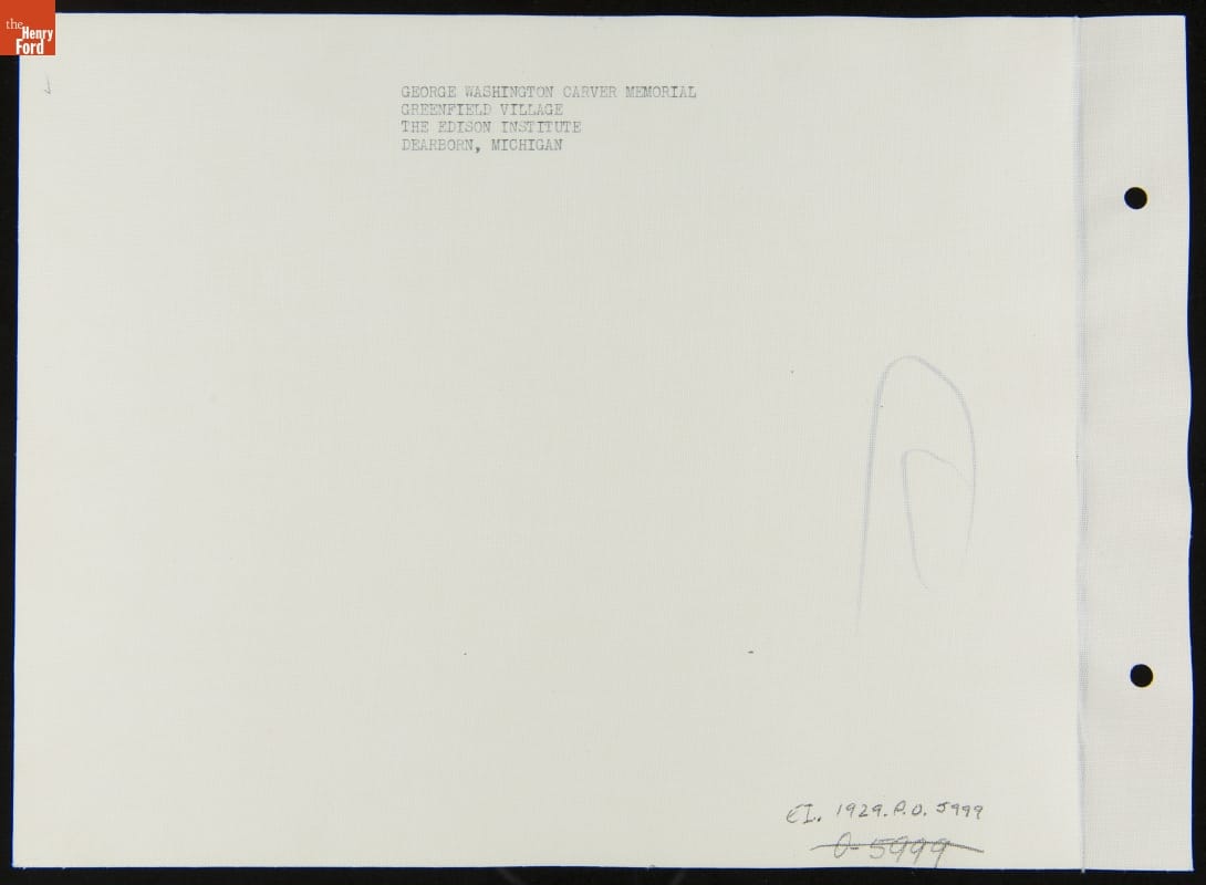Henry Ford first thought of a building dedicated to George Washington Carver after the two met in 1937. Construction got underway in Ford's Greenfield Village in the spring of 1942. Ford's architect loosely based the building on Carver's descriptions of his southwest Missouri birthplace. By about 1950, a sign was installed over the door and the building had been whitewashed.