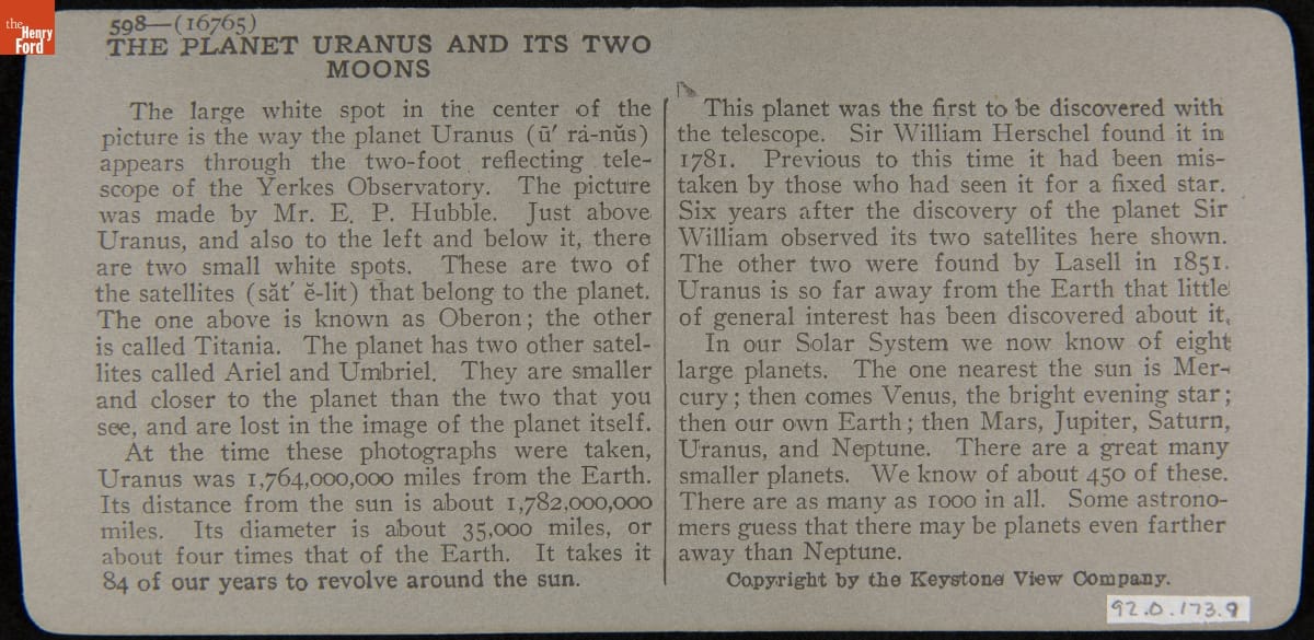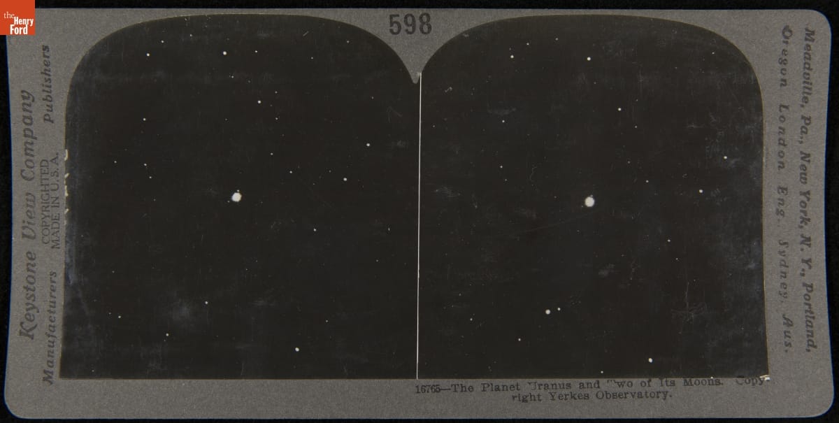 front, left side: Keystone View Company / Manufacturers / COPYRIGHTED / MADE IN U.S.A. / Publishers front, top: 598 front, right side: Meadville, Pa., New York, N.Y., Portland, Oregon, London, Eng., Sydney, Aus. front, bottom: 16765--The Planet Uranus and Two of Its Moons. Copyright Yerkes Observatory