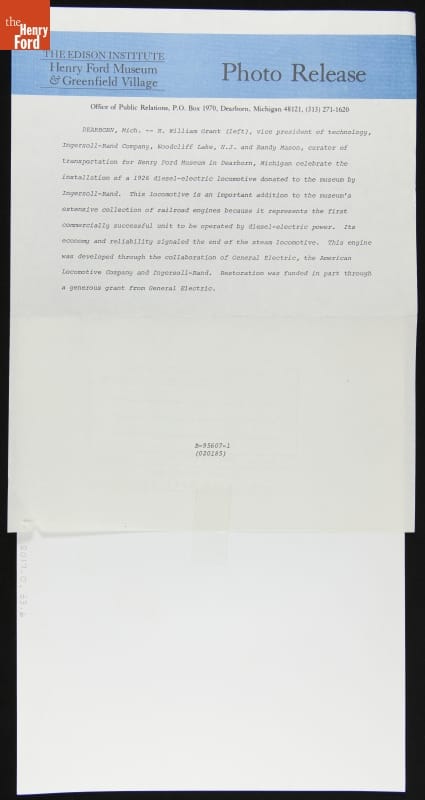 Ingersoll-Rand, in collaboration with General Electric and American Locomotive Company, built diesel-electric locomotive #90 in 1926. Ingersoll-Rand used the locomotive in the railyard at its Phillipsburg, New Jersey, plant for some 40 years. Diesel-electric power proved more efficient and cost-effective than steam. Donated to The Henry Ford in 1970, the locomotive received a cosmetic restoration in 1983.