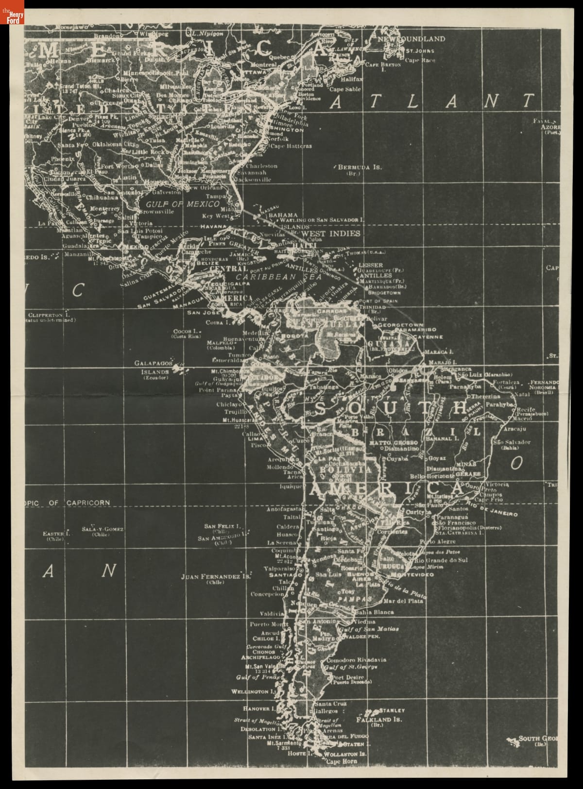 Map Showing Routes of Communication between Dearborn, Michigan and Fordlandia, Brazil, circa 1928