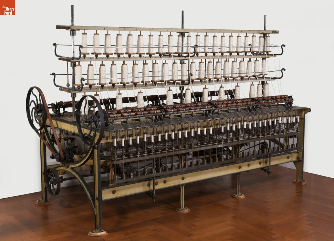 Spinning frames spin cotton fiber into yarn and then wind it onto a bobbin. This throstle spinning frame could simultaneously spin 64 strands of yarn. (Throstle -- an old name for a song thrush -- refers to the bird-like sounds the machine made.) Machines like this helped produce the large quantities of yarn that growing industrial weaving operations needed in the early and mid-1800s.