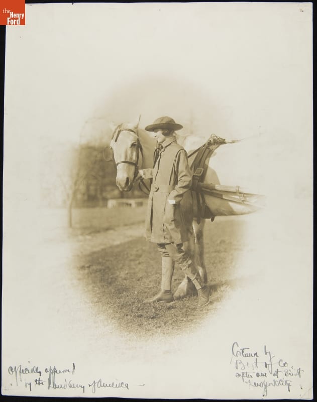 After the United States entered World War I in 1917, Americans worried about labor and food shortages as a result of men going off to fight. Organizations like the Woman's Land Army of America and the Woman's National Farm and Garden Association recruited and trained women to perform agricultural work across the country. This woman modeled the Land Army uniform.