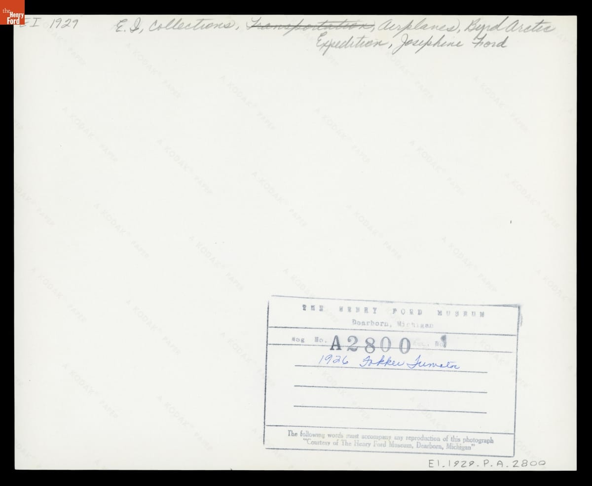 Explorer Richard Byrd and pilot Floyd Bennett flew this Fokker F.VII Tri-Motor airplane toward the North Pole on May 9, 1926. Though Byrd is generally credited with reaching the pole, controversy remains. Edsel Ford financed the expedition, and Byrd acknowledged his patron by naming the plane Josephine Ford, after Ford's daughter.