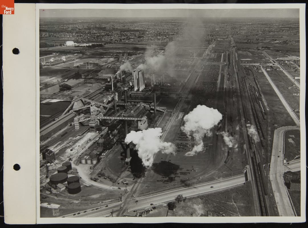 The powerhouse, foundry, and storage bins at Ford Motor Company's Rouge plant are seen in this aerial photograph from 1935. Also visible is the Pere Marquette Railway's Rougemere Yard, located along the eastern edge of the Rouge complex. This railyard handled most of Pere Marquette's freight traffic out of the Detroit area.