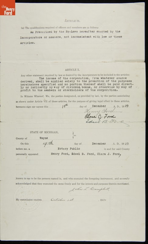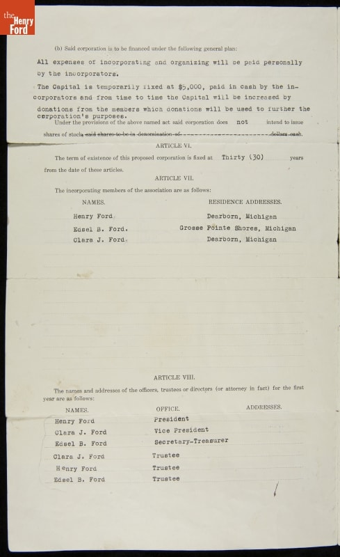 The Edison Institute--now known as The Henry Ford--was incorporated as a non-profit, educational institution in December 1929. Its Articles of Association named Henry, Clara, and Edsel Ford as officers and trustees. Ford believed the everyday objects he loved to collect reflected American progress not recorded in written histories. Ford's intent? To use the best of the ordinary and extraordinary works of America's people to teach and inspire.