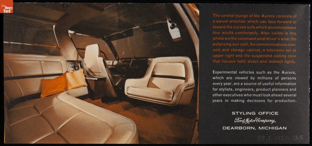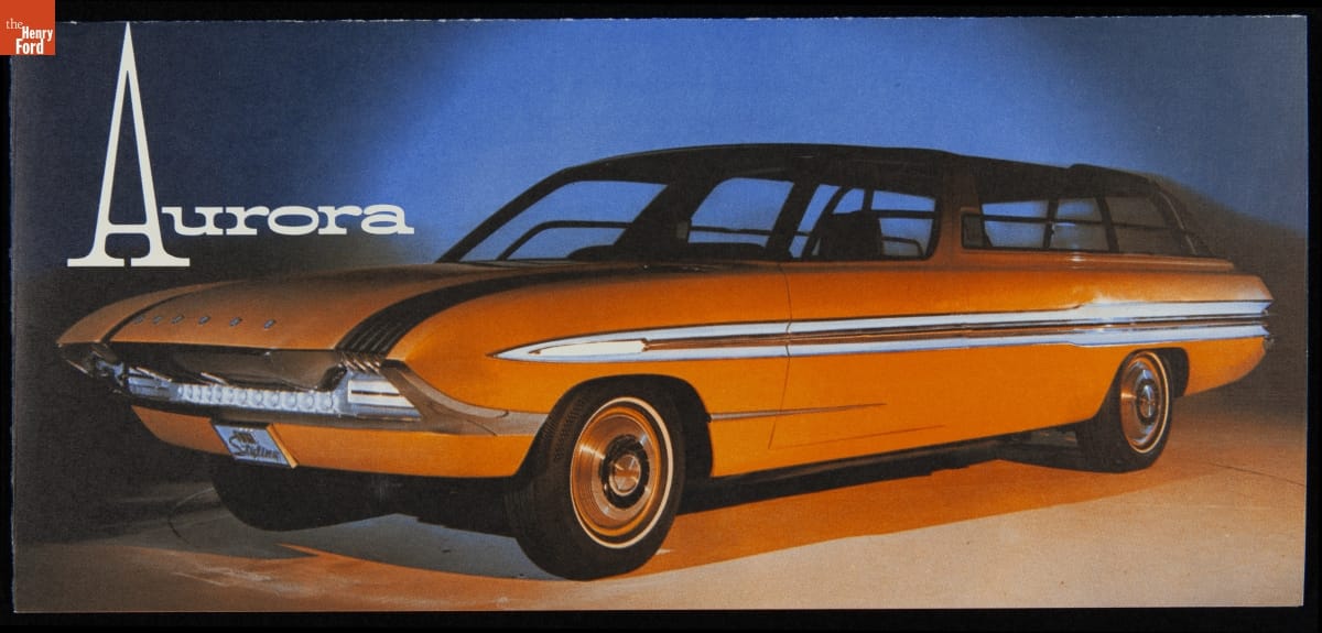Ford debuted its Aurora concept car at the 1964 New York World's Fair. The futuristic station wagon featured illuminated panels along its body sides; a polarizing sunroof that changed from transparent to opaque with the push of a button; and, instead of a conventional steering wheel, a powered steering bar that required just one half turn from lock to lock.