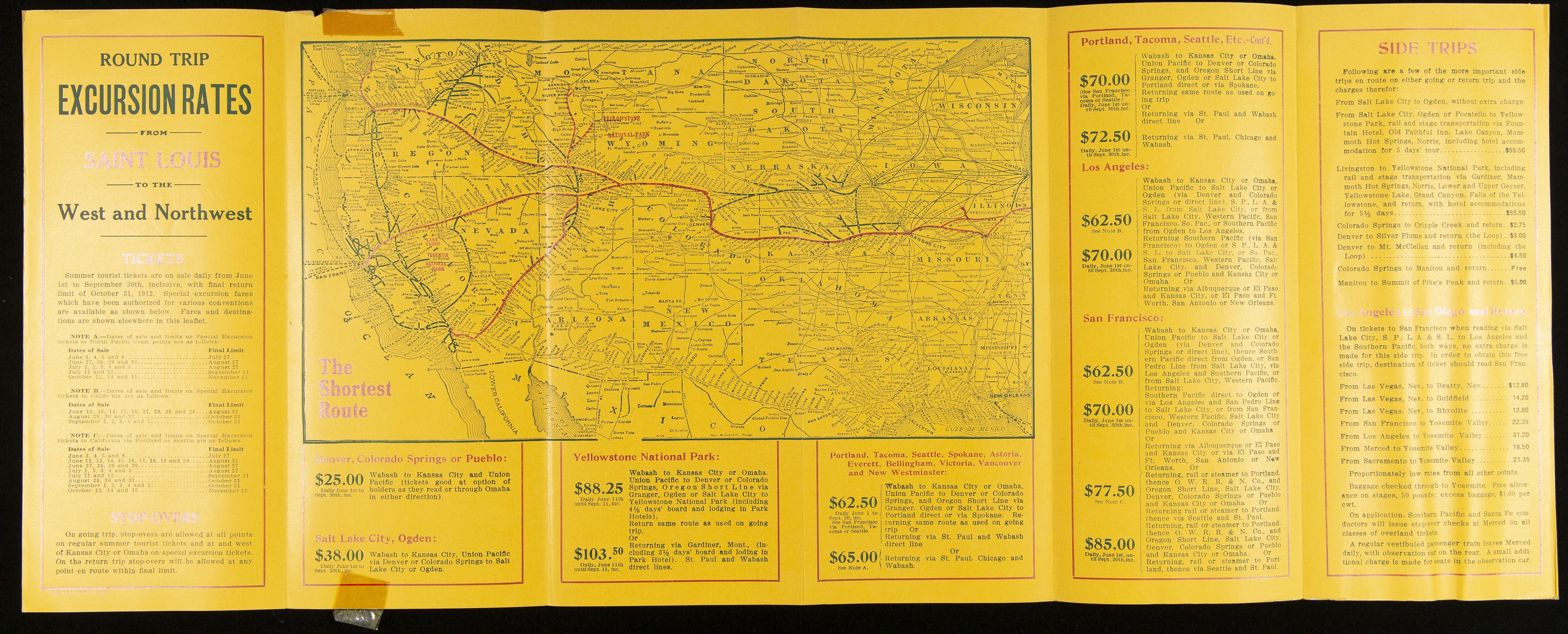 The Wabash Railway, with origins dating back to 1838, was a strong Midwestern carrier until Amtrak took over the national passenger railroad system in 1971. This timetable advertised Wabash's passenger trains to the western United States, operated jointly with Union Pacific. Low-cost "colonist" fares were offered to attract immigrant travelers heading west to start new lives.