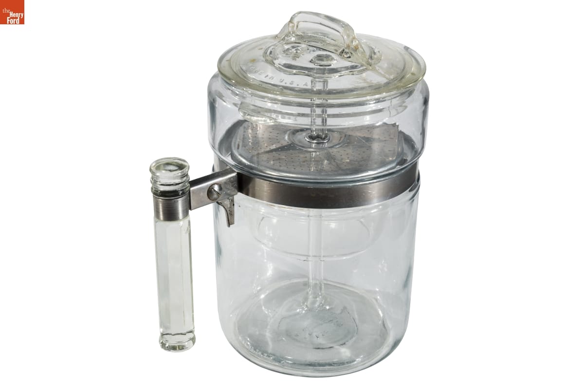 on bottom of percolator: A-4 / PYREX / J on metal band on percolator, near handle: STAINLESS on left side of percolator handle: STAINLESS on right side of percolator handle: PYREX on bottom of basket stand: PYREX(R) on top of lid: PYREX / MADE IN U.S.A. on side of lid: F-C 78-C