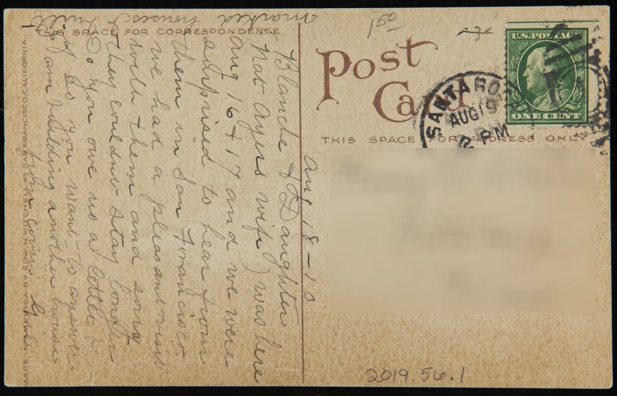This postcard features the bird's-eye view that horticulturalist Luther Burbank had of his 40-acre experimental garden from the balcony of his new home in Santa Rosa, California. He could watch the staff move wheelbarrows and other tools from the carriage shed into the garden plots and watch house construction around the perimeter of his land. This included a home built by the person who mailed the post card.