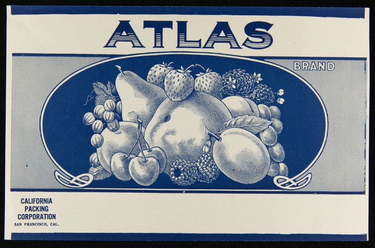 In 1869, the transcontinental railroad opened eastern markets to the West Coast produce industry for the first time. As produce companies shipped crates of fruits and vegetables across the country, they needed a way to distinguish their goods from their competitors'. Colorful, eye-catching labels, like this one for Atlas Brand Blackberries, were created to attract grocers purchasing goods from wholesale markets.