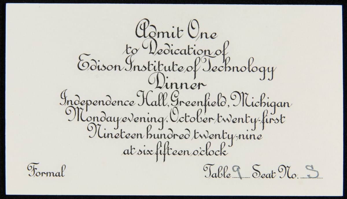 Admit One to Dedication of Edison Institute of Technology Dinner, October 21, 1929