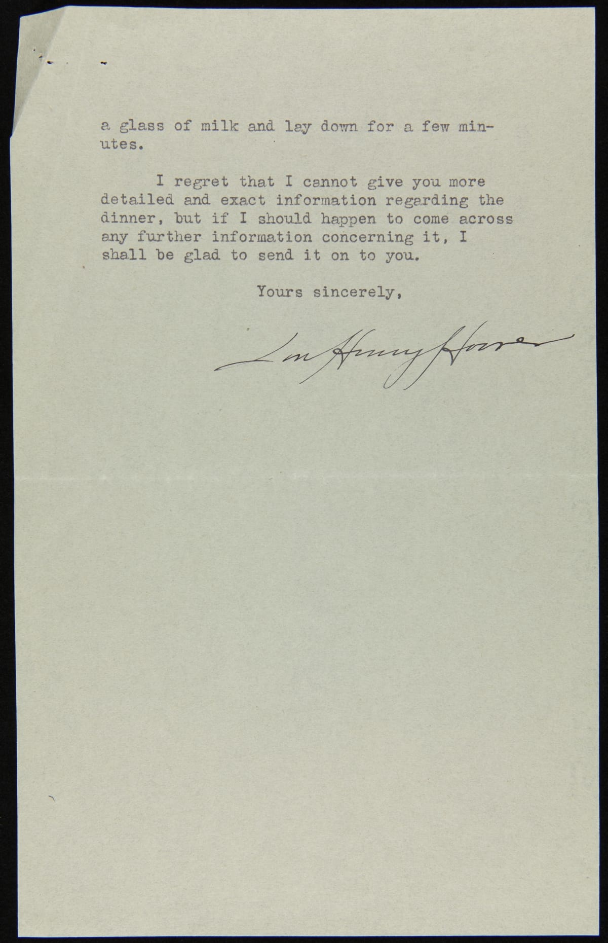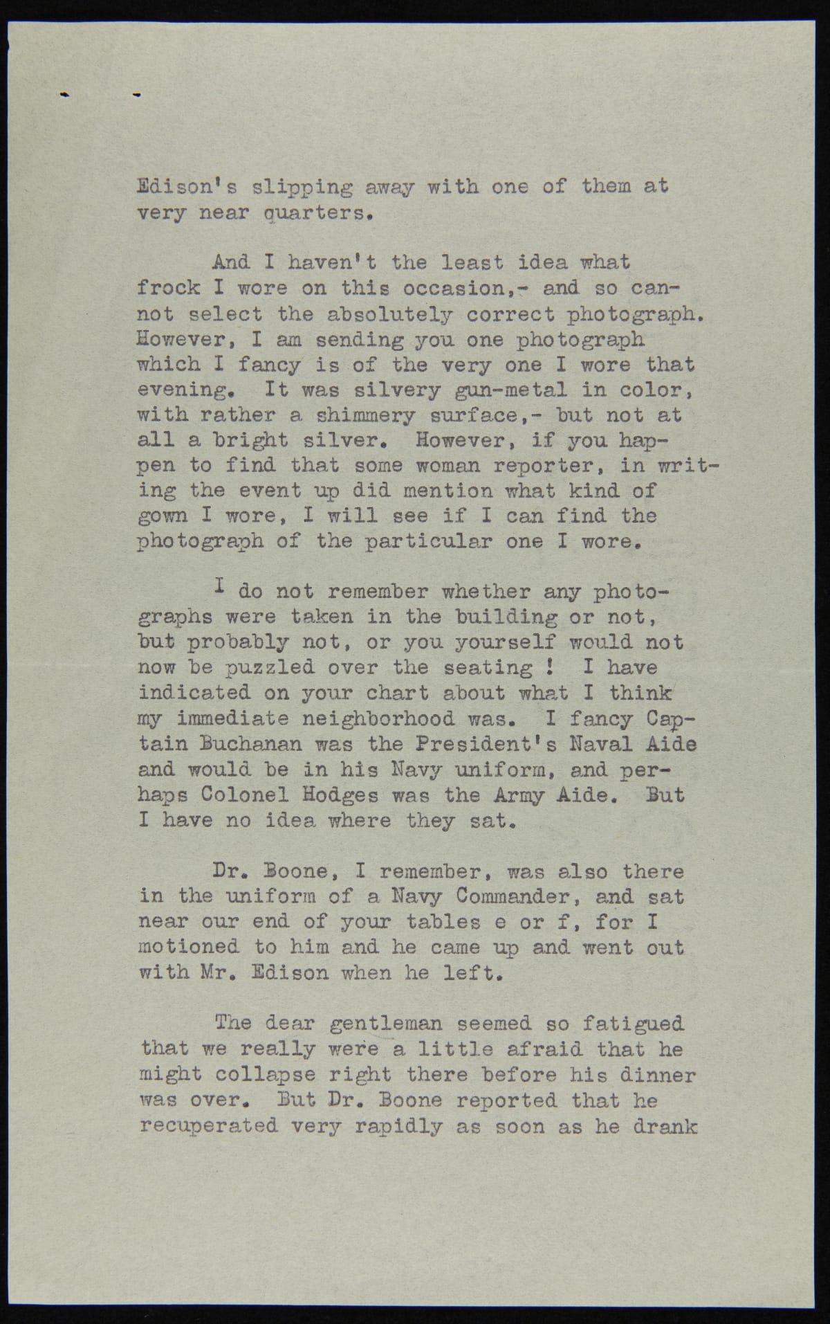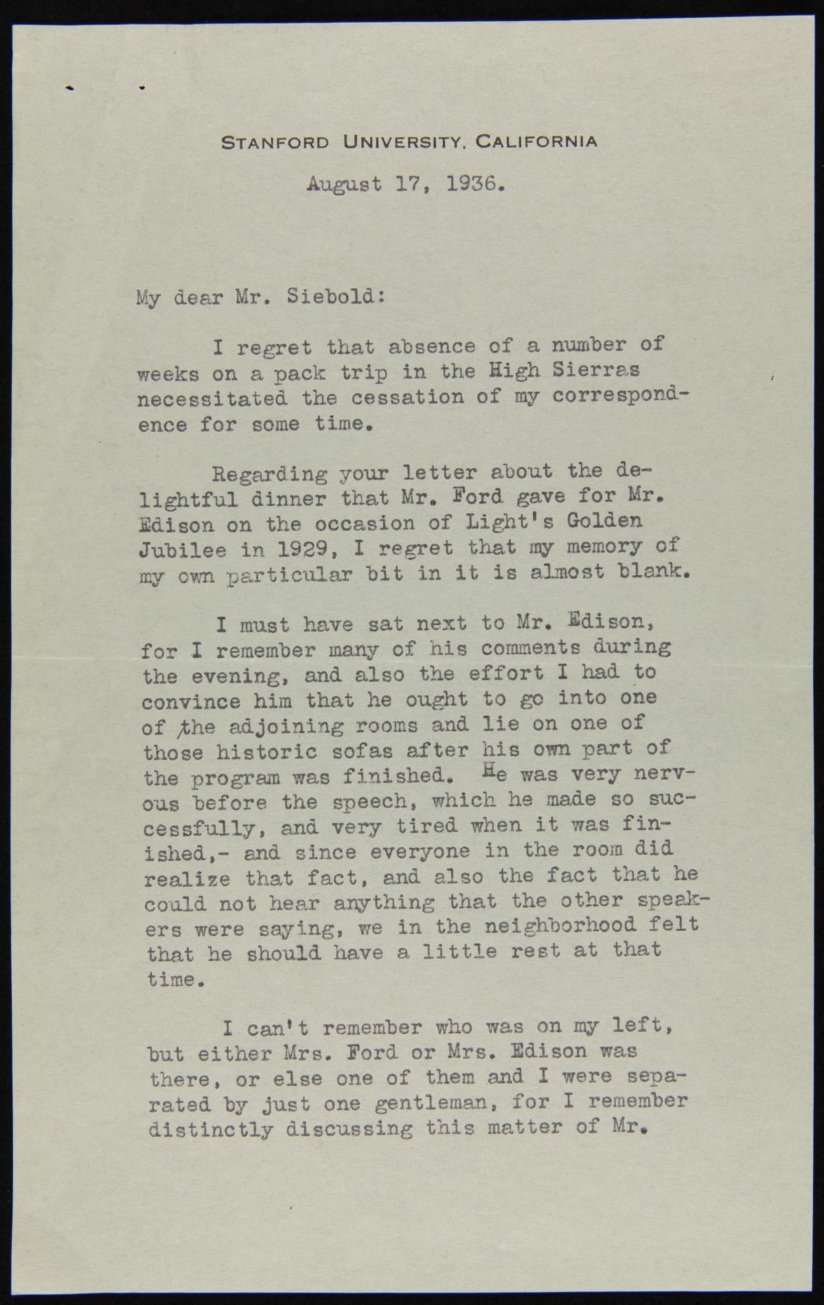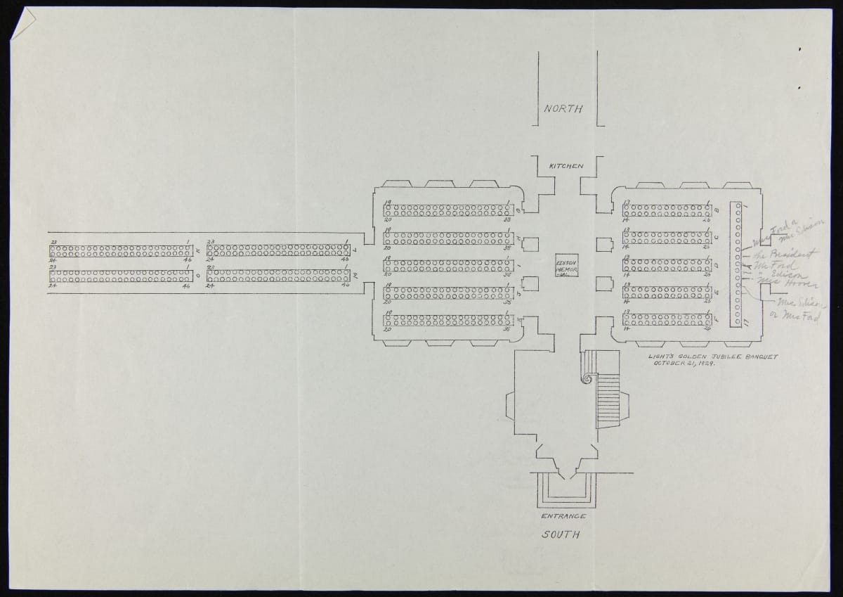 In the mid-1930s, more than six years after the Light's Golden Jubilee celebration, Henry Ford commissioned a panoramic painting of that evening's banquet. Letters were sent to attendees--including those at the head table--asking where they sat and for a photograph so that their image could be included in the painting. Former First Lady Lou Henry Hoover replied and gave her impressions of the evening.
