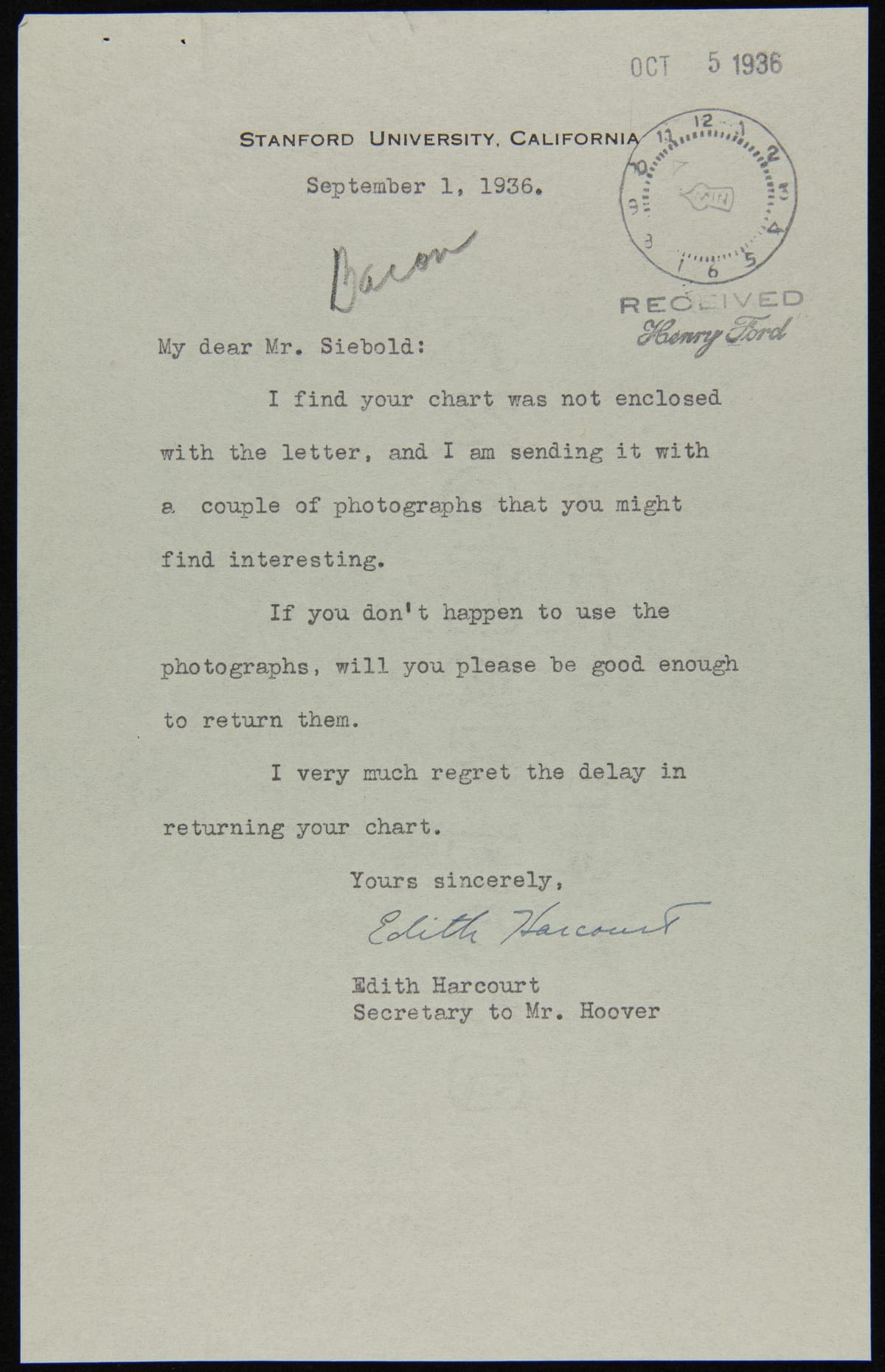 Correspondence between E.G. Liebold and Lou Henry Hoover regarding Light's Golden Jubilee Banquet Painting, 1936