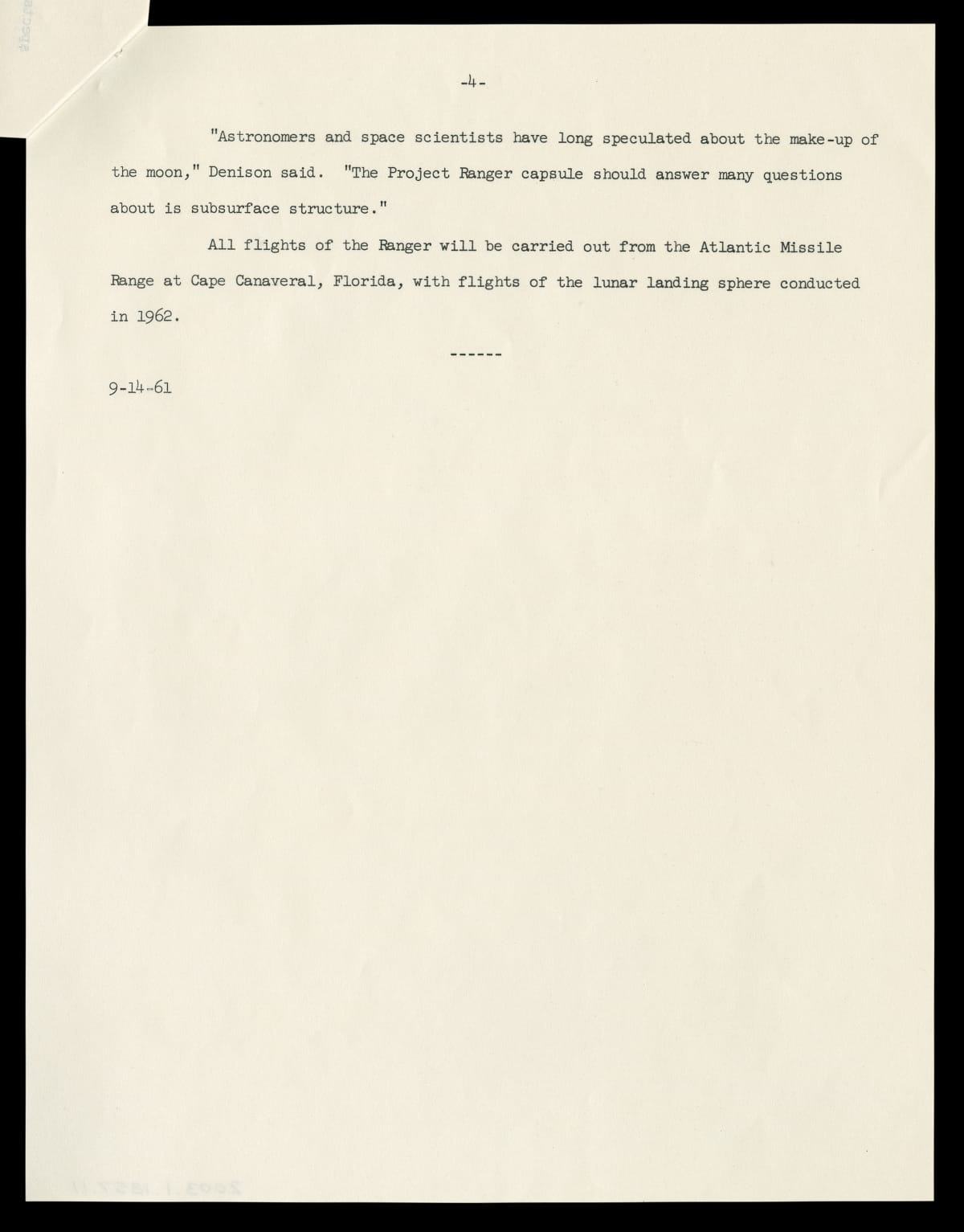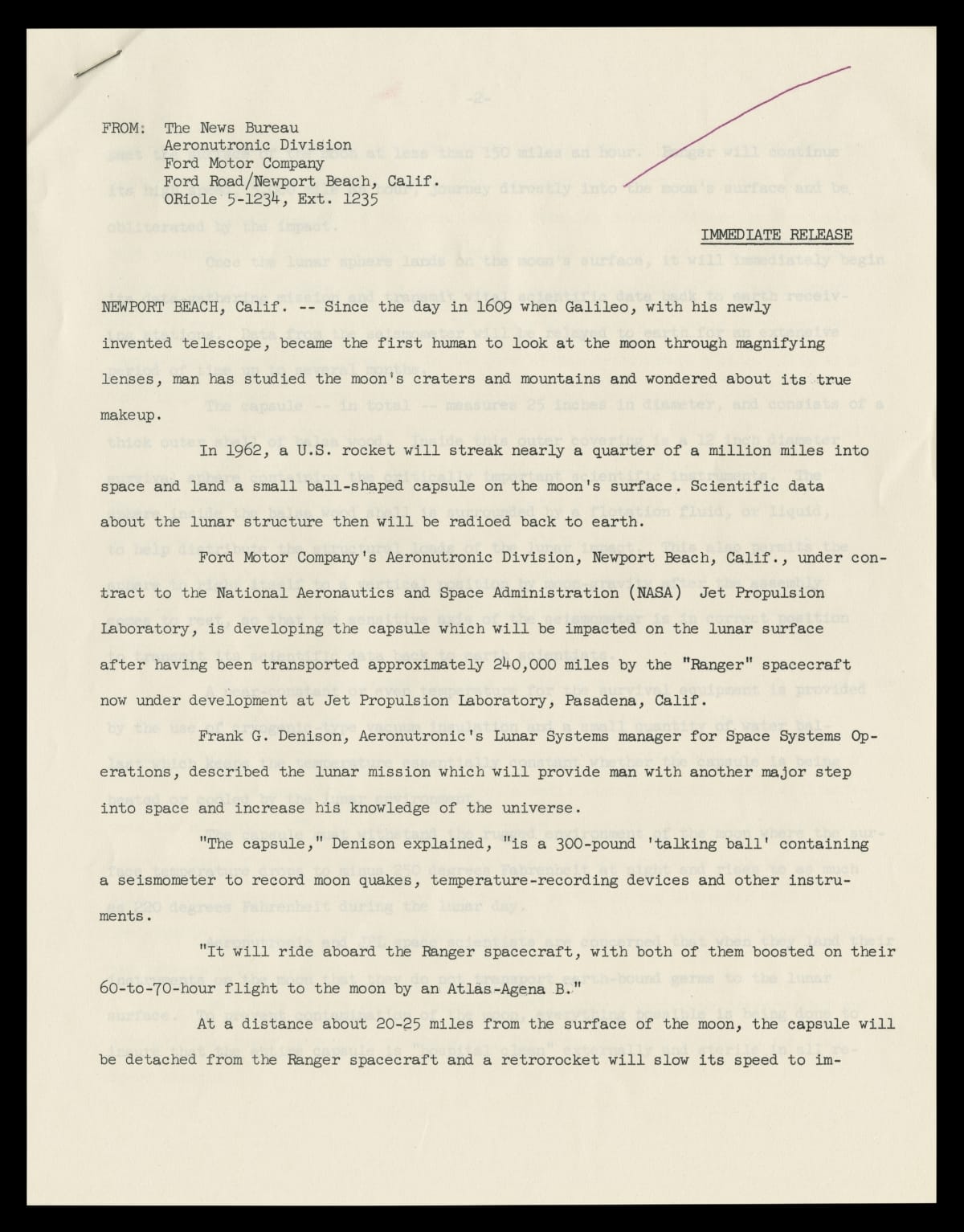 Press Release RE: Lunar Capsule Built by Ford Motor Company Aeronutronic Division, September 14, 1961