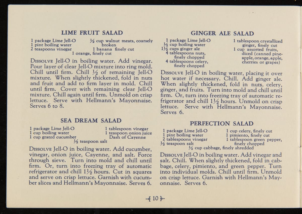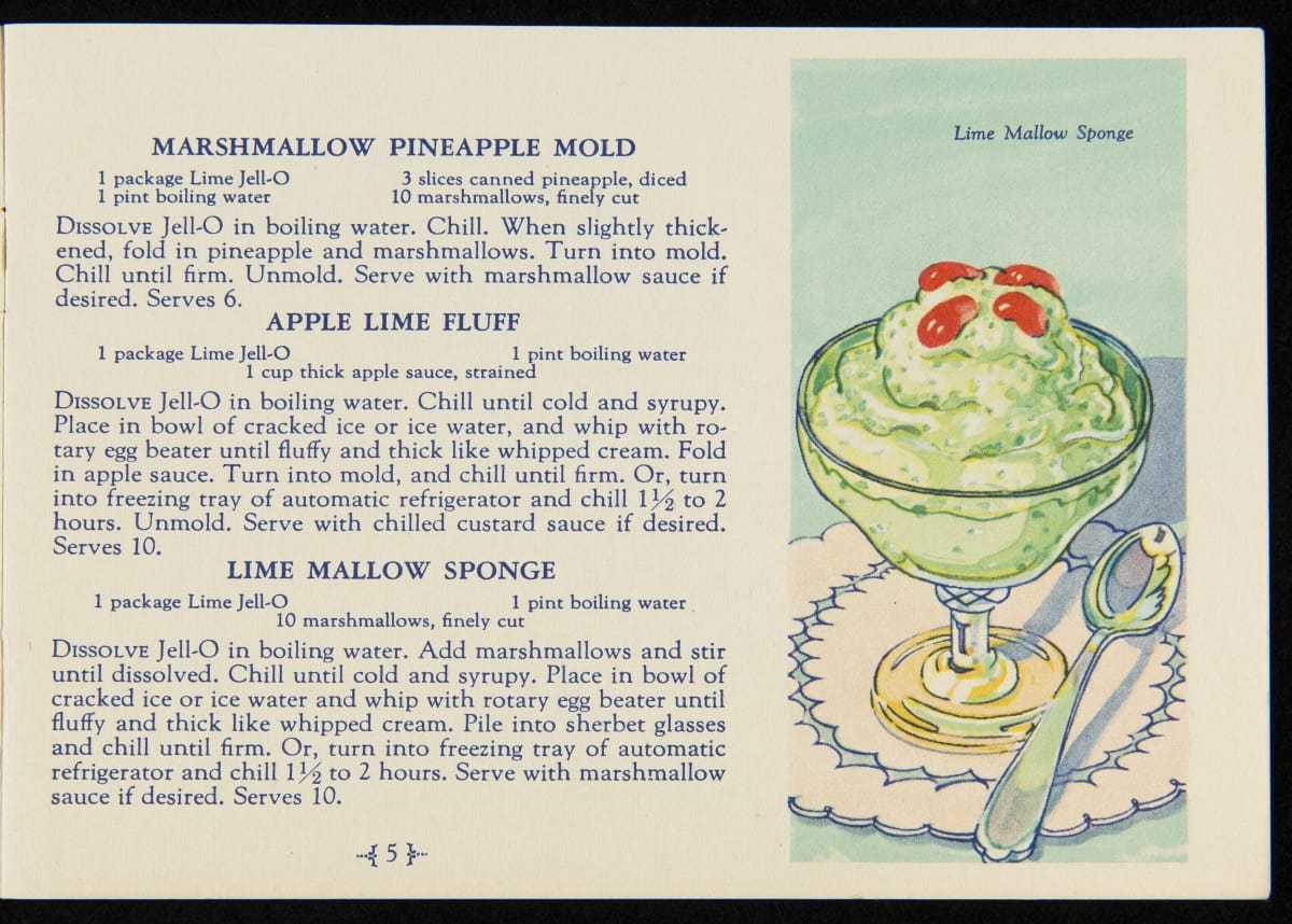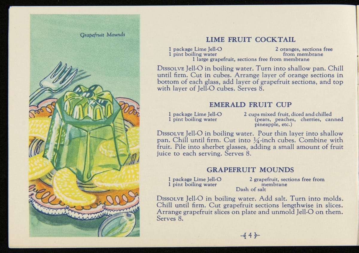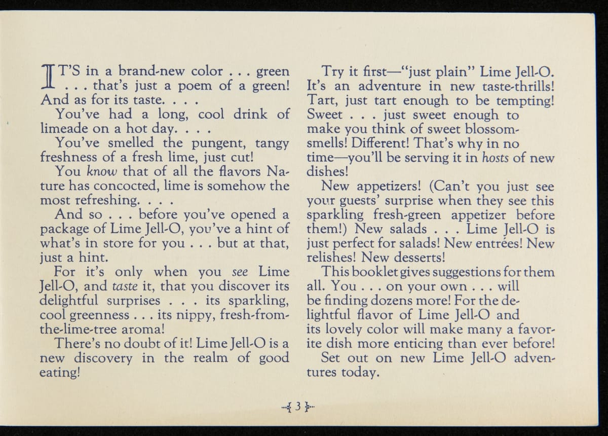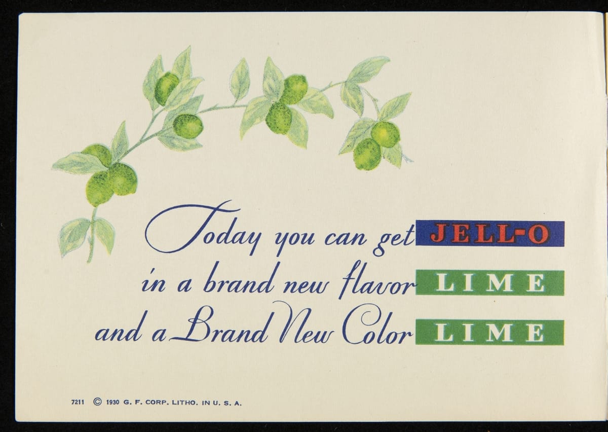 When Jell-O was first introduced in 1897, it was sold in four flavors: Strawberry, Raspberry, Orange, and Lemon. Over the next decade, the flavors of Cherry, Chocolate, and Peach were introduced with Lime Jell-O debuting in 1930. Recipe booklets, like this one, proved to be an invaluable marketing strategy, providing homemakers with creative uses for the ready-made product.