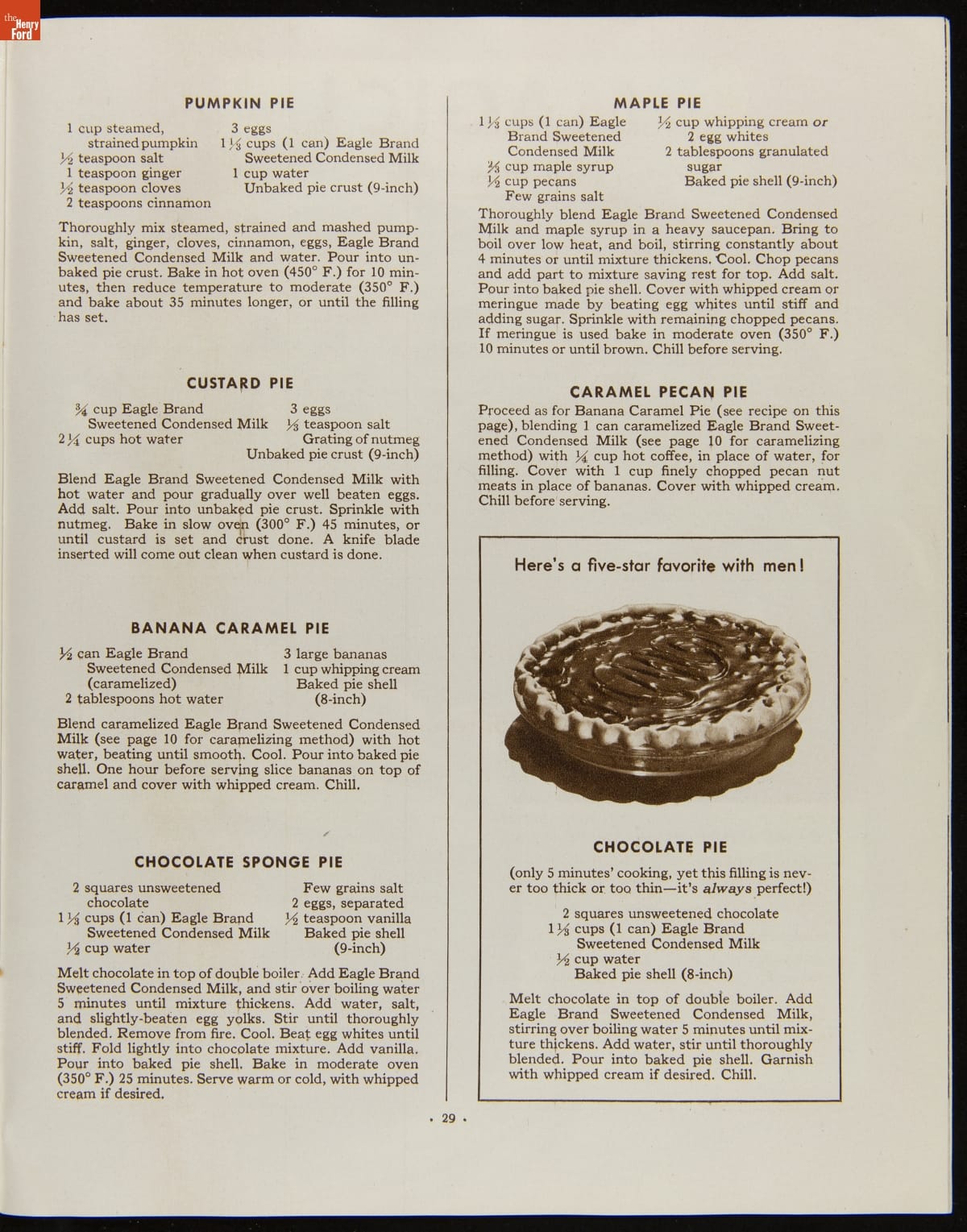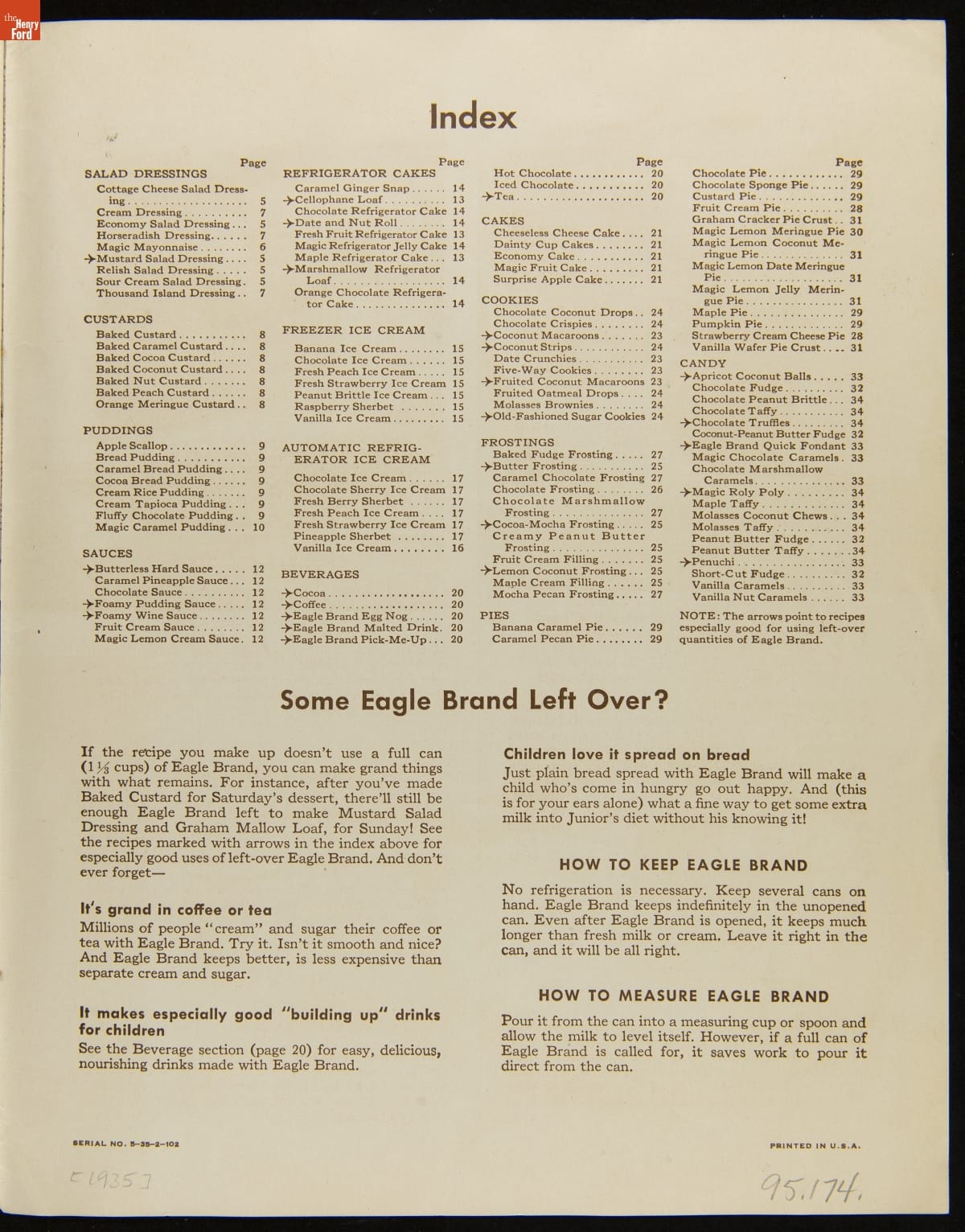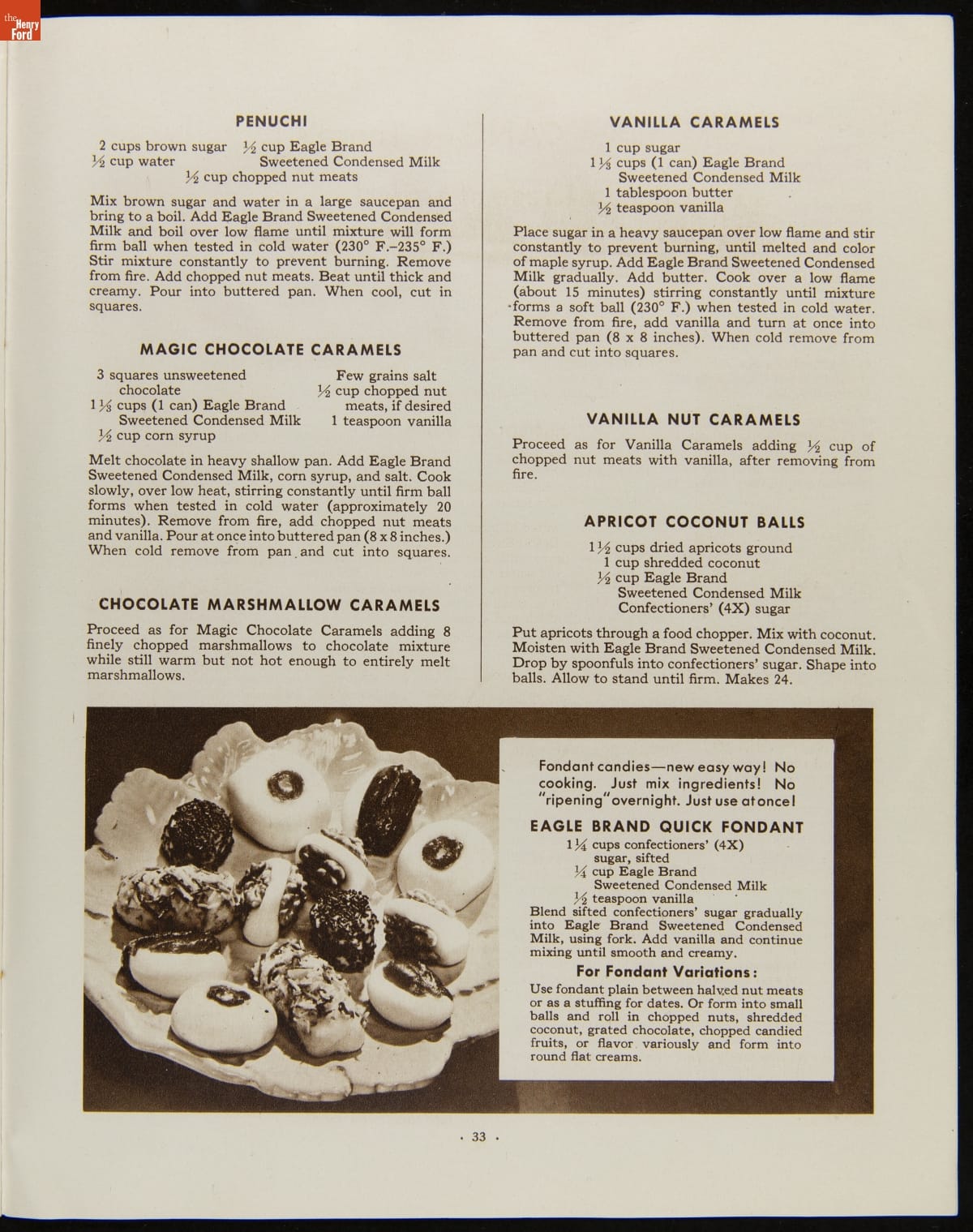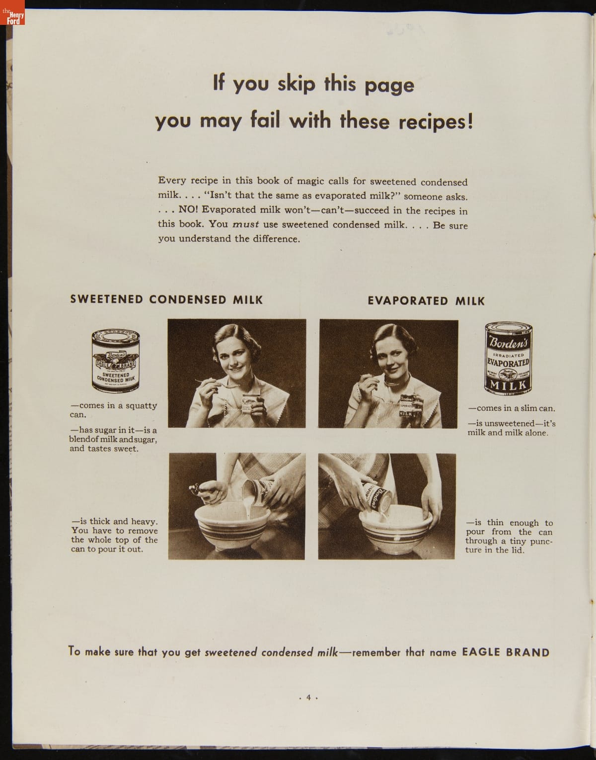 Before the invention of pasteurized milk, fresh milk was often unsafe to drink, as it soured quickly. After experimenting with ways to preserve milk, Gail Borden introduced Eagle Brand Sweetened Condensed Milk in 1856. What was advertised as nourishment for young children soon gained popularity as a baking and cooking ingredient. This booklet from 1935 features recipes using Borden's Condensed Milk.