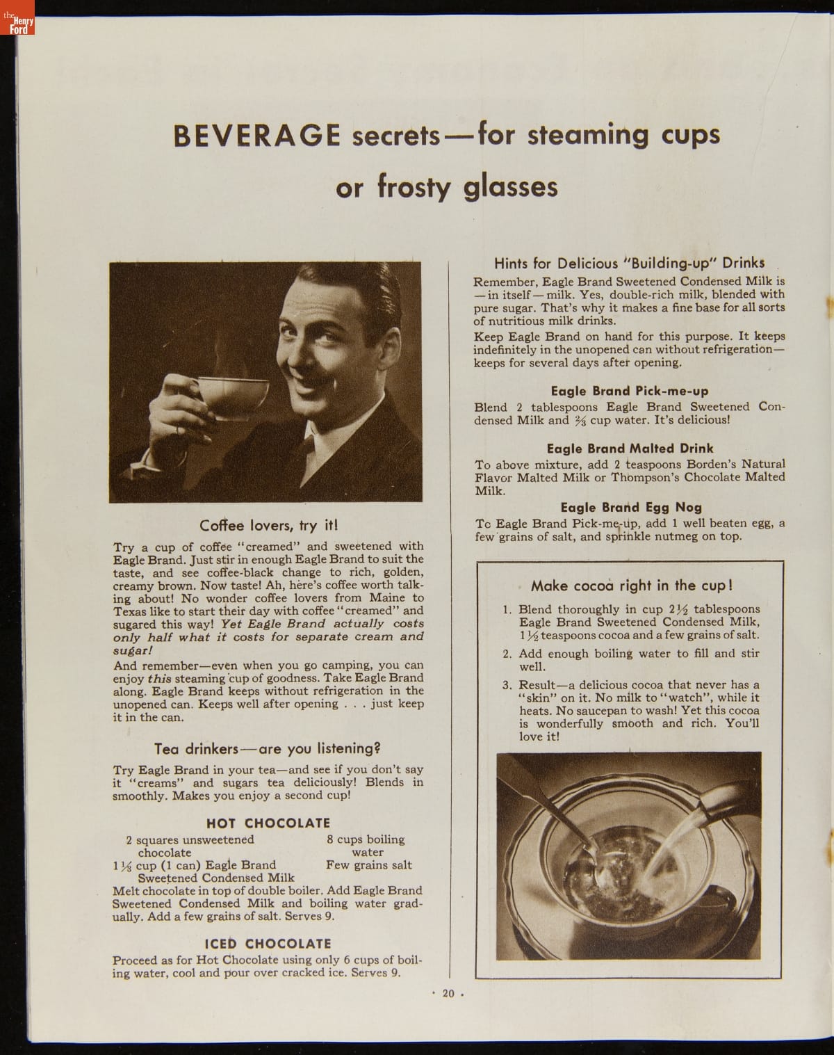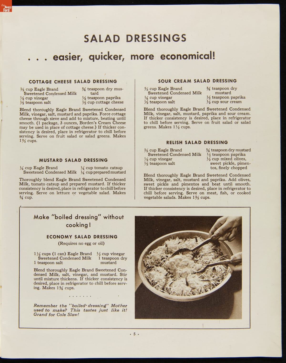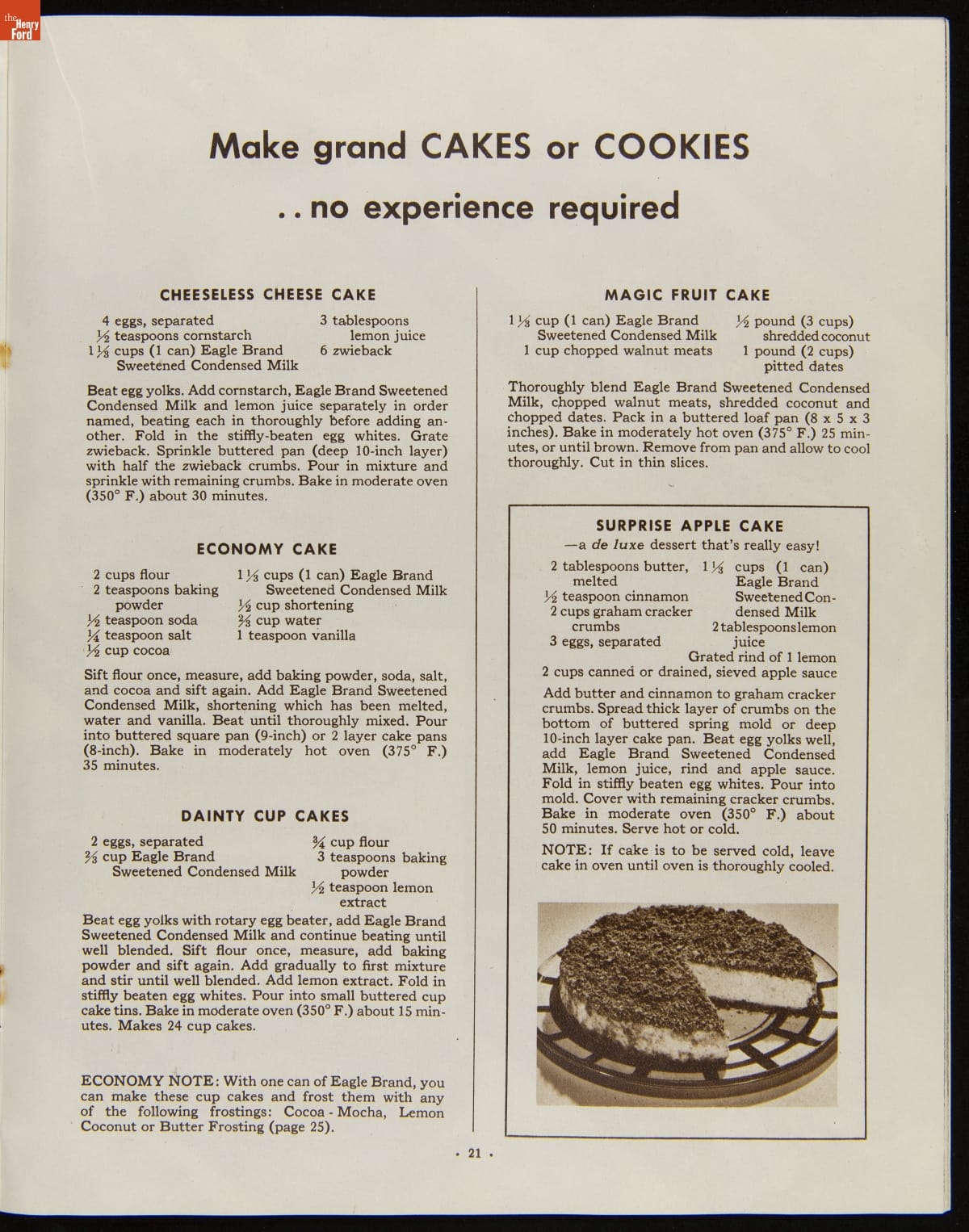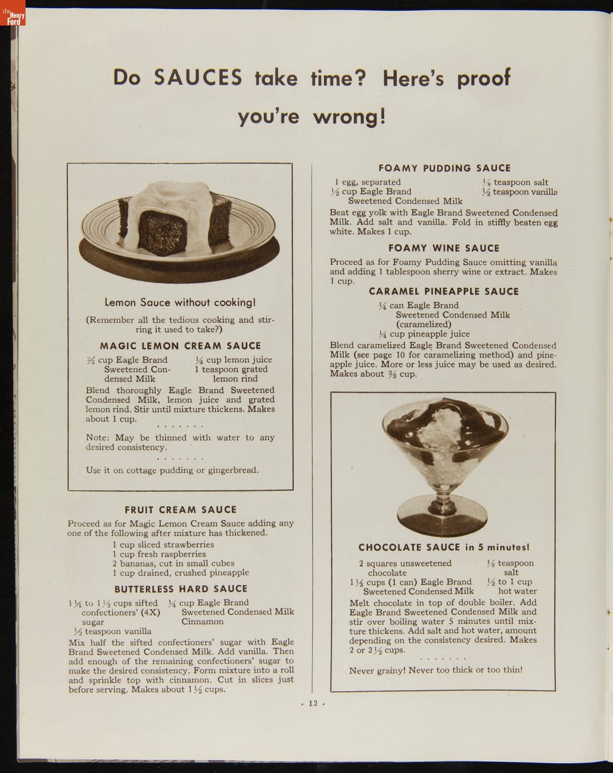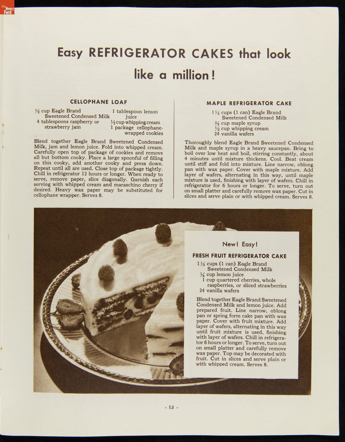 Before the invention of pasteurized milk, fresh milk was often unsafe to drink, as it soured quickly. After experimenting with ways to preserve milk, Gail Borden introduced Eagle Brand Sweetened Condensed Milk in 1856. What was advertised as nourishment for young children soon gained popularity as a baking and cooking ingredient. This booklet from 1935 features recipes using Borden's Condensed Milk.