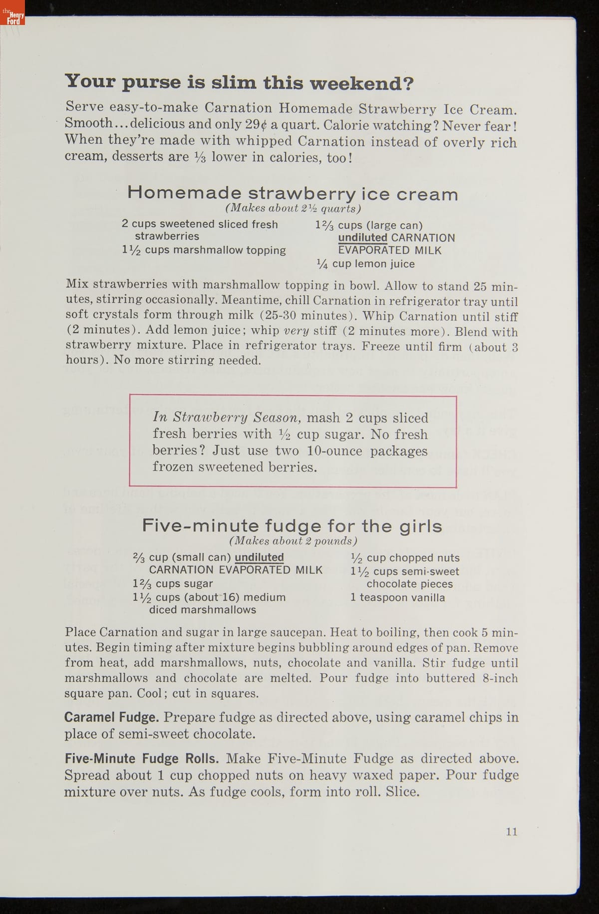 In 1899, Elbridge Amos Stuart developed his evaporated milk product -- his alternative to fresh milk, which was quick to sour -- and sold it as the Carnation Evaporated Milk Company. Although similar to condensed milk, evaporated milk does not contain sugar. This allows for a broader range of uses -- as noted in this booklet, which offers fun and simple recipes for teenagers using Carnation evaporated milk.