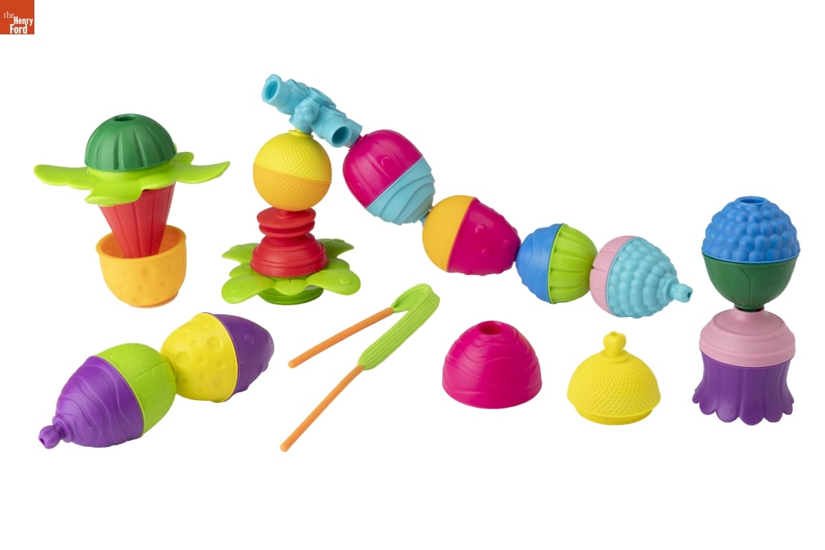 Designed by French company Lalabloom, these interconnecting beads are intended for long term use by children aged 10 months to 4 years. The beads can be clipped, stacked, screwed, or threaded together -- each method is suitable for a different age group. Toys like these help children practice both their gross and fine motor skills.