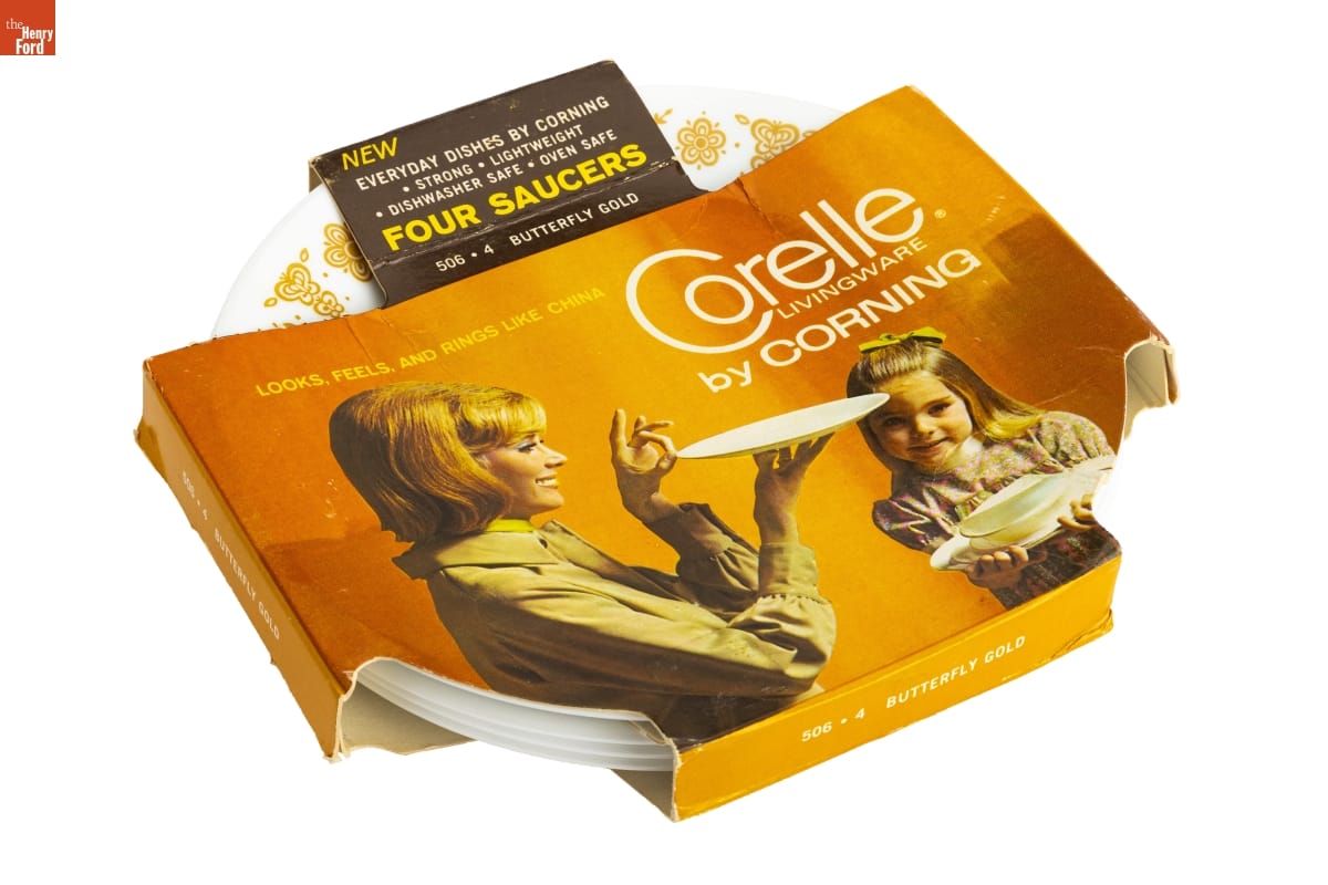 on top of packaging: NEW / EVERYDAY DISHES BY CORNING / STRONG LIGHTWEIGHT / DISHWASHER SAFE / OVEN SAFE / FOUR SAUCERS / 506 4 BUTTERFLY GOLD / LOOKS, FEELS AND RINGS LIKE CHINA / Corelle / LIVINGWARE / by CORNING on front, sides and back of packaging: 506 4 BUTTERFLY CUPS on bottom of packaging: Corelle / LIVINGWARE / by CORNING / AMAZING NEW MATERIAL INVENTED / BY CORNING SCIENTISTS / looks, feels and rings like china / resists breaking, chipping, scratching and crazing / completely safe in the dishwasher and oven / lightweight / CORNING / CORNING GLASS WORKS / CORNING NEW YORK / 506 4 BUTTERFLY GOLD / CORELLE LIVINGWARE / REPLACEMENT PROMISE: / Corning promises to replace without charge any piece of Corelle(R) Livingware that should break, craze, chip or stain during 2 years of normal household use.