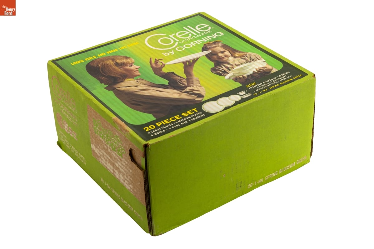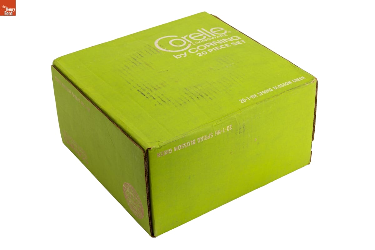 on top of packaging: LOOKS, FEELS AND RINGS LIKE CHINA / Corelle / LIVINGWARE / by CORNING / 20 PIECE SET / 4 LARGE PLATES 4 MEDIUM PLATES / 4 BOWLS 4 CUPS AND 4 SAUCERS / NEW / EVERYDAY DISHES BY CORNING / STRONG LIGHTWEIGHT / DISHWASHER SAFE / OVEN SAFE / 20 1 NH SPRING BLOSSOM GREEN on front and back of packaging: 20 1 NH SPRING BLOSSOM GREEN on proper right side of packaging: Corelle / LIVINGWARE / by CORNING / 20 PIECE SET / CONTENTS: 4 EA. LARGE & MEDIUM PLATES / LARGE BOWL - CUP AND SAUCER / 20 1 NH SPRING BLOSSOM GREEN on proper left side of packaging: CORNING / CORNING GLASS WORKS / CORNING NEW YORK 14830 on bottom of packaging: Corelle / LIVINGWARE / by CORNING / 20 PIECE SET / 20 1 NH SPRING BLOSSOM GREEN