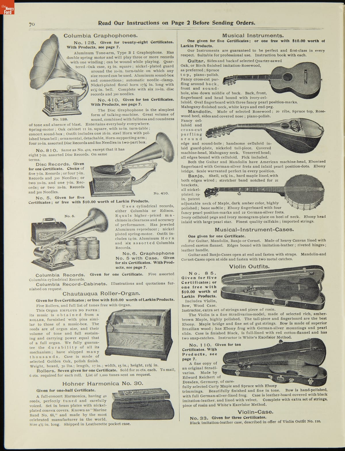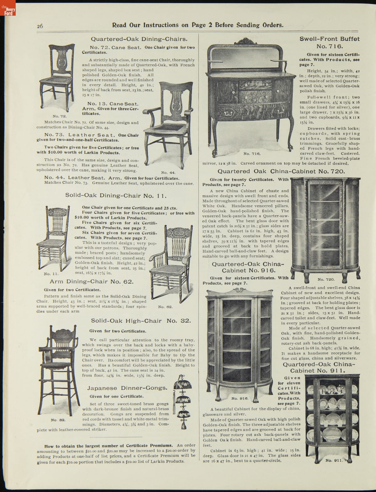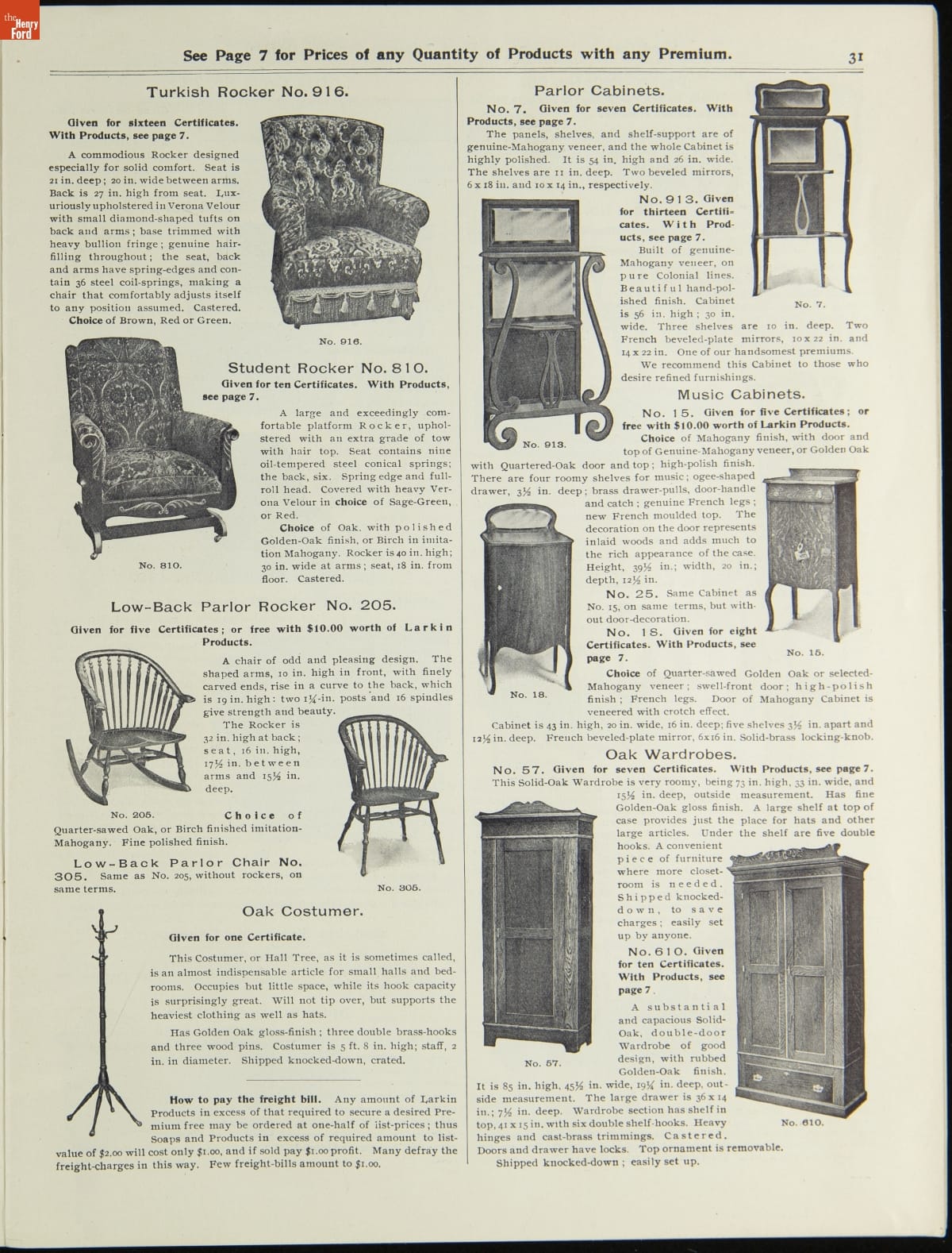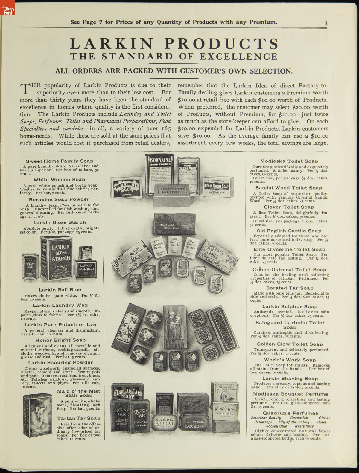 John D. Larkin established a soap manufacturing company in 1875. He hired his brother-in-law, Elbert Hubbard, as a salesman. Hubbard developed "The Larkin Idea," a plan that sold goods directly to consumers through mail-order catalogs and offered incentivizing giveaways. It was a success. By the early 1900s, Larkin's catalogs contained pages of products and even more pages of premiums from which customers could choose.